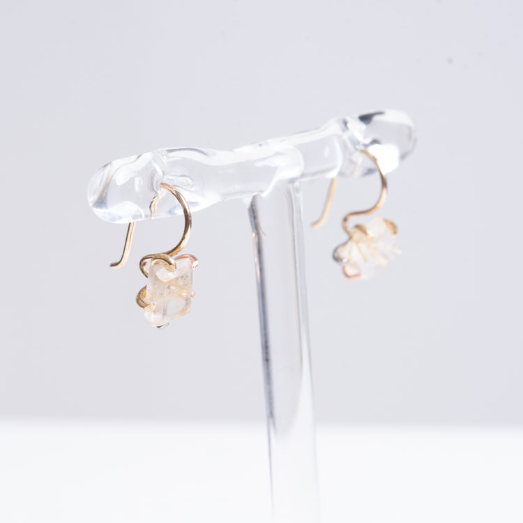 Medium, hand cut and asymmetric Rutilated Quartz earrings set in 14k yellow, rose and white gold prongs and ear wire. Catches the light just so, with subtle golden rutiles.