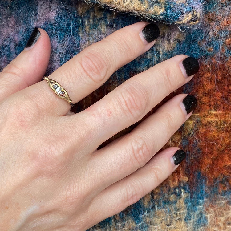 Artful slim ring consisting of 3 sparkling rose cut diamonds set in 14K mixed gold channel. Slim oxidized silver band contrasts nicely. Size 6.5, but can be re-sized for a fee. Stacks well with the other diamond bands from Variance or maybe something from your own collection.