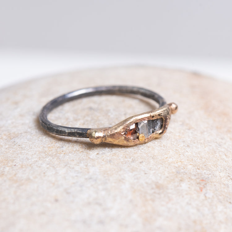 Artful slim ring consisting of 3 sparkling mixed diamonds set in 14K gold channel. Slim oxidized silver band contrasts nicely. Size 7, but can be re-sized for a fee. Stacks well with the other diamond bands from Variance or maybe something from your own collection.