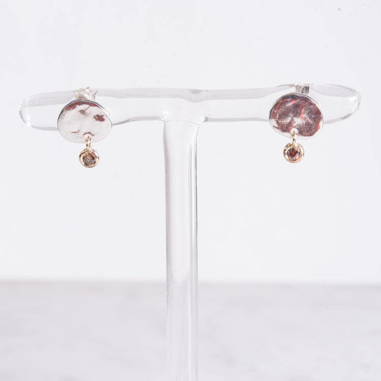Sterling silver stud earrings with a single cognac diamond bezel set in 12k gold dangling just below. A lovely every day earring. Sold as a pair.