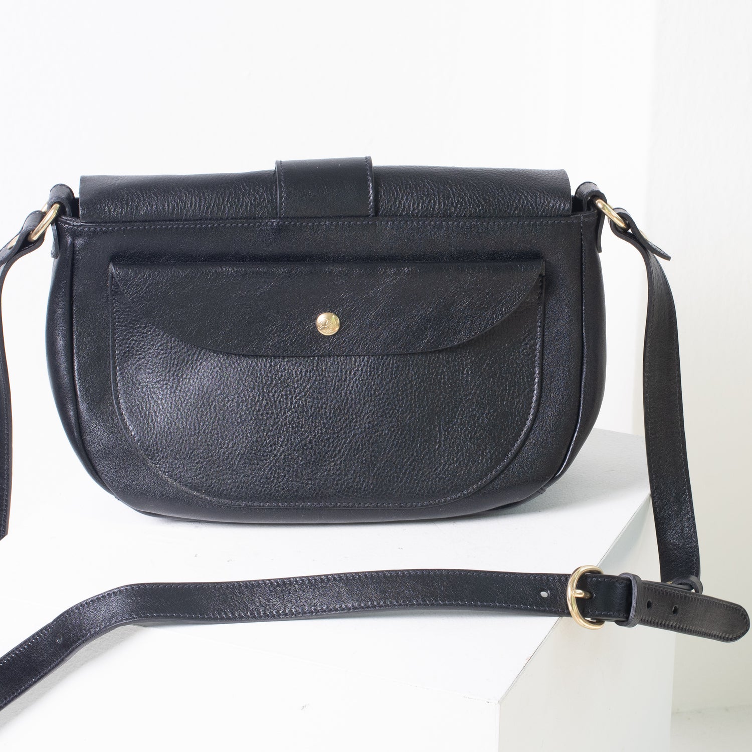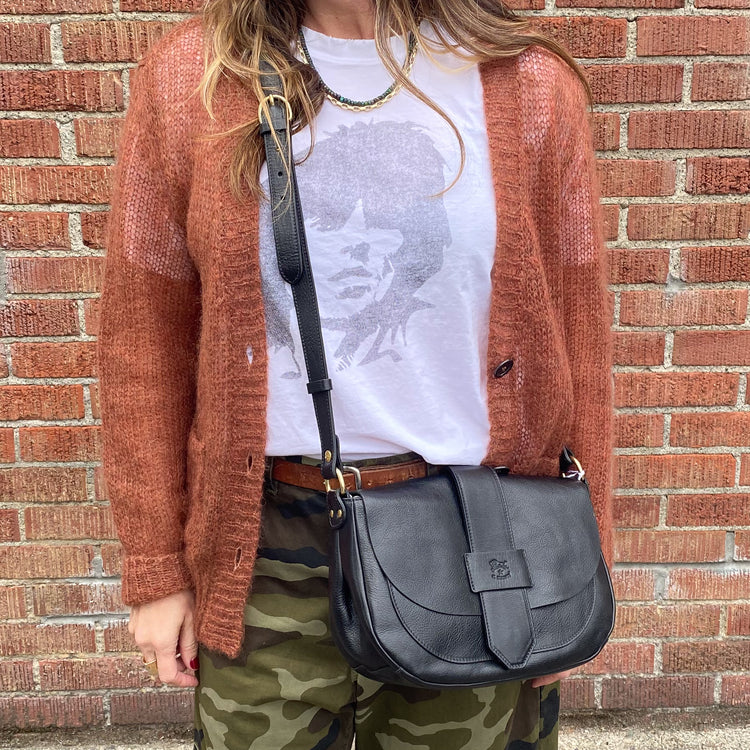 A shop favorite, medium sized crossbody bag with enough compartments to satisfy the most organized. Adjustable shoulder strap with brass hardware. Top flap opens with a snap, with one large interior zippered compartment and second exterior open pocket under flap. Thick black canvas lining. Second exterior pocket opens with a snap on the backside for your keys, phone etc. Measures approx. 7"h, 10.5"w and 3.5"D.