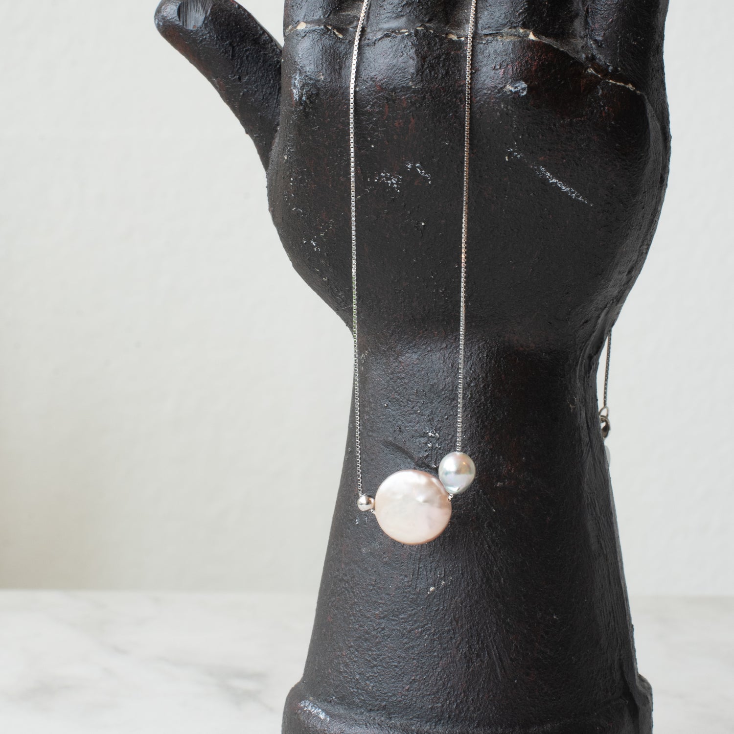 The Enso necklace pairs a luminous Lake Biwa pearl with with a softly cool toned Japanese Akoya pearl suspended from a sterling silver chain. 17" chain can be shortened by pinching down on small silver ball and pulling lightly on chain.