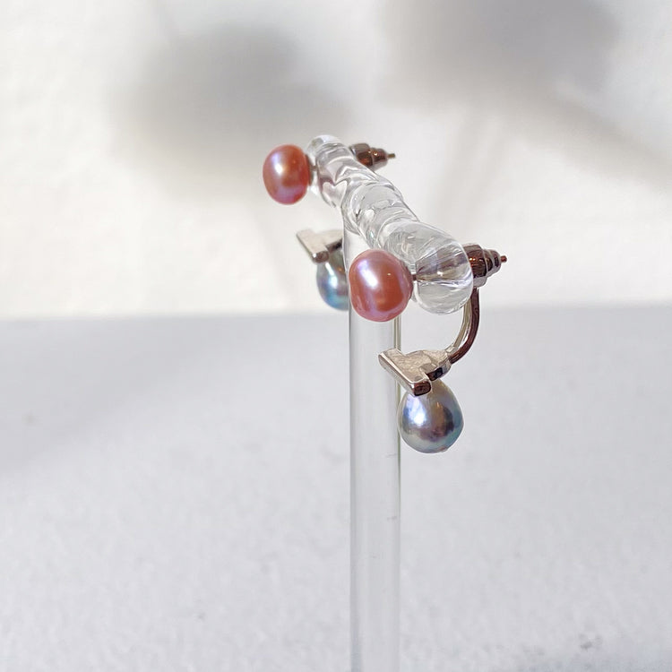 Featuring a simple, modernist design the Futari earrings are crafted with a single warm toned Lake Biwa pearl and a second cool blue toned Japanese Akoya pearl "jacket" that fits behind the ear. Crafted in sterling silver.