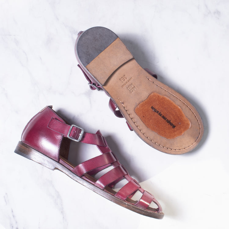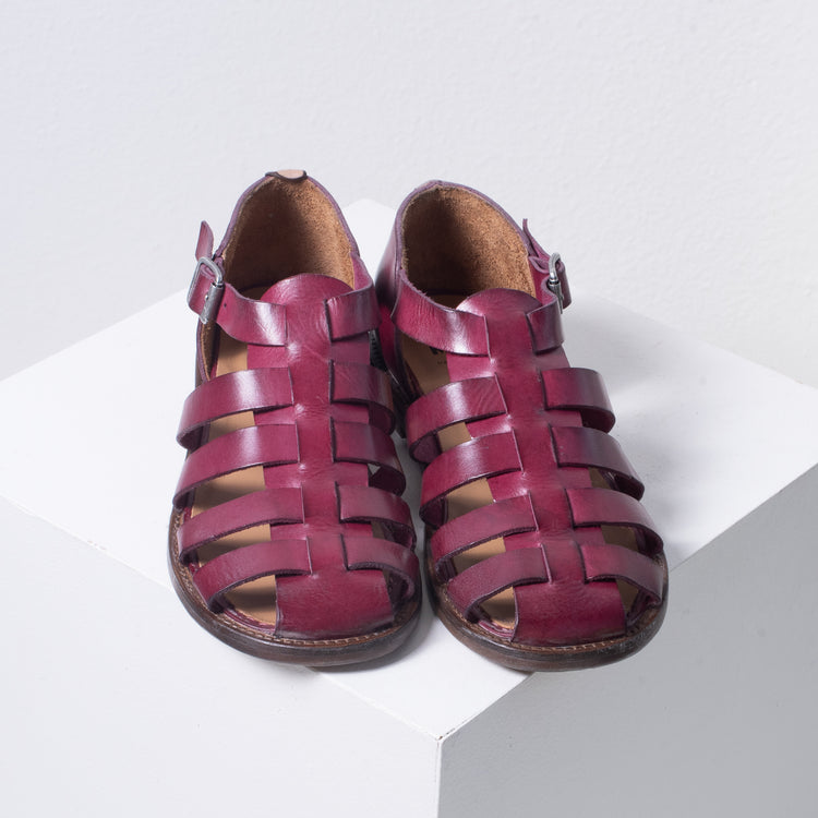 A classic fisherman style sandal in buttery cranberry leather. All leather stitched construction with partial rubber sole and heel strike for durable wear. Adjustable ankle strap.