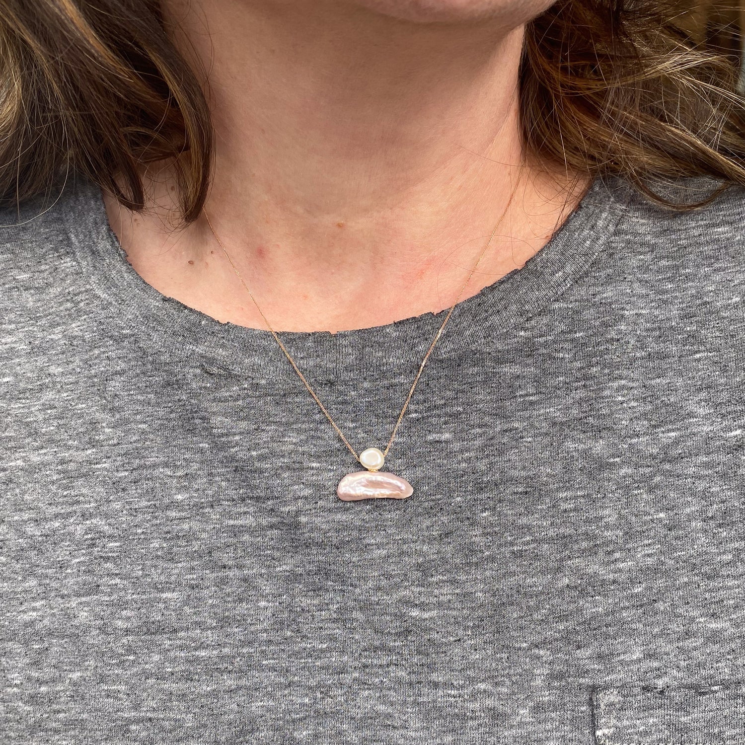 Authentic Lake Biwa pearls are prized for their exceptional luster and distinctive shapes. The Mizumi Zen balances two distinct pearls into a minimal and modern design. 18k rose gold chain is 17" but can be made shorter by squeezing silver ball and pulling on chain. Neato.
