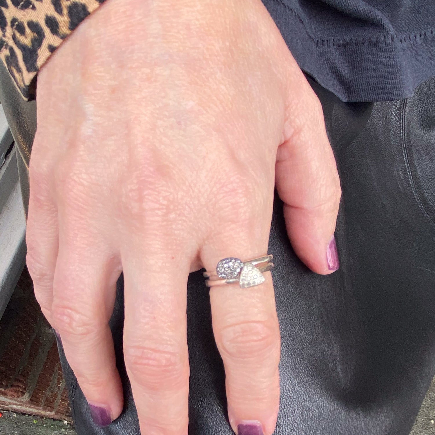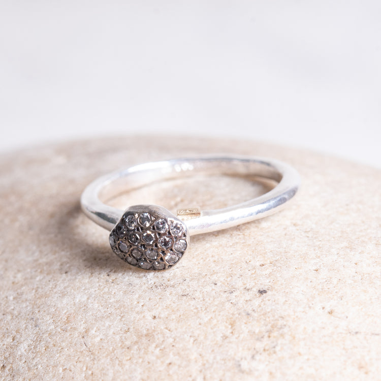 Petite sterling silver ring with an oval face of oxidized silver set with 14 icy grey diamonds, .16cts. Size 6.5. Pairs well with triangular "Debra ring" seen in second and third  image.