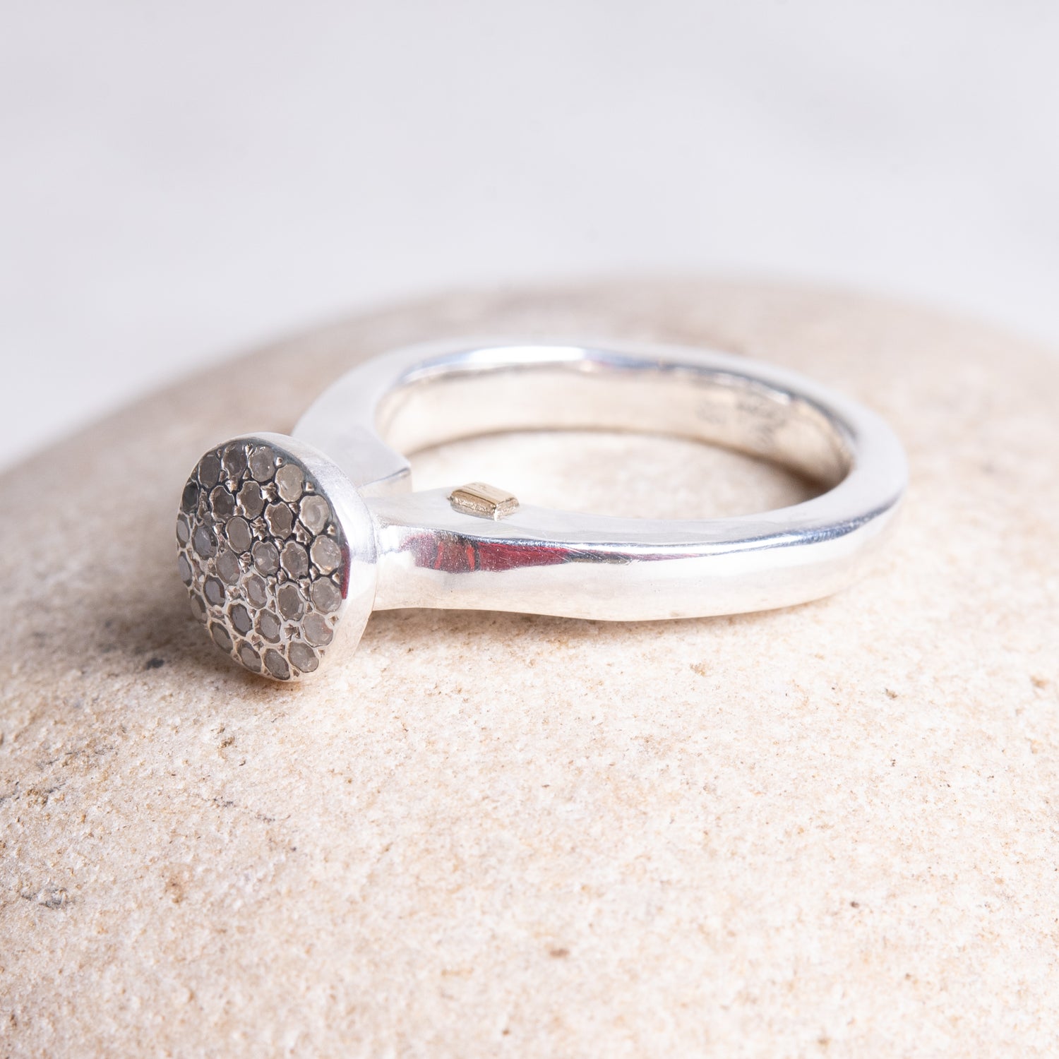 Sterling silver ring with a raised circular "head" of 30 tiny 8x8 cut diamonds, .34cts. Stacks well with "bluie" ring (image 4) or something from your own collection. Size 7.