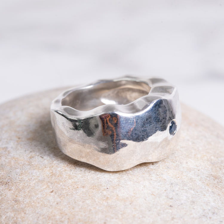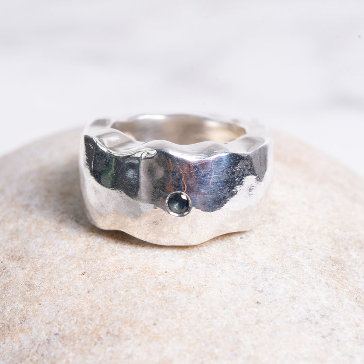 Chunky and substantial solid sterling silver ring with single .23ct blue sapphire.  Size 7.5.