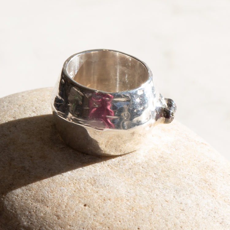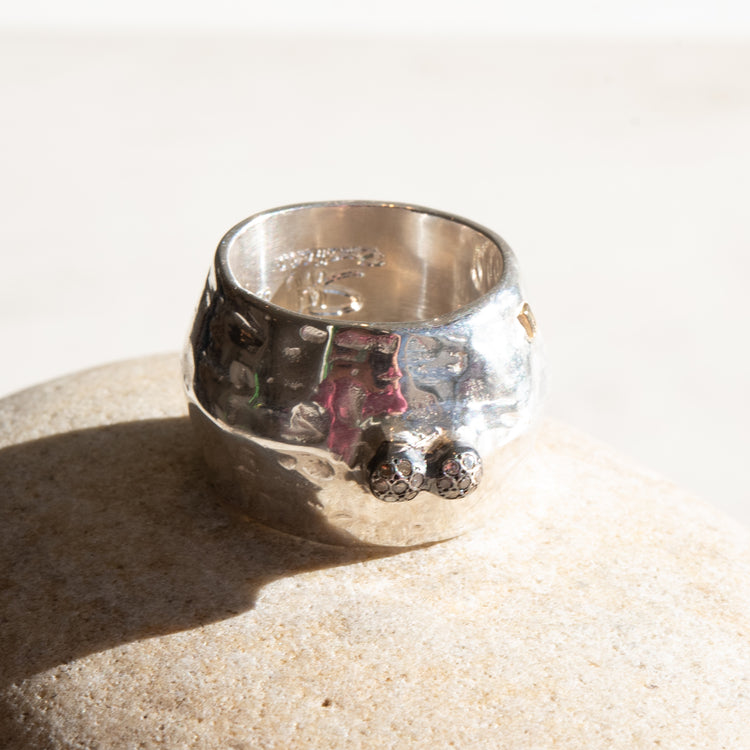 A substantial and impactful designed ring, the "Noot" features a heavy and wide hammered sterling silver band with 2 small heads of oxidized silver covered in tiny cognac diamonds, .19cts. Size 7.5 only.