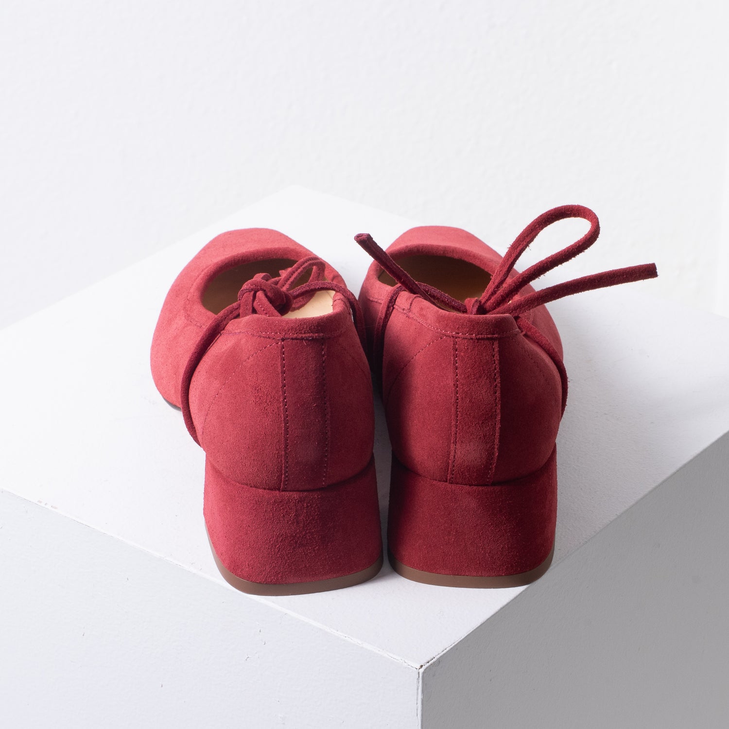 Thoughtful and modern mid heel ballet crafted with rich suede. We love the charming tie, that holds your foot just so and the sculptural 1.5" suede covered heel.  Leather lined and leather sole with partial rubber heel strike for durable wear. So pretty on! Dress it up or down, this is a versatile charmer that goes with everything. A shop favorite!