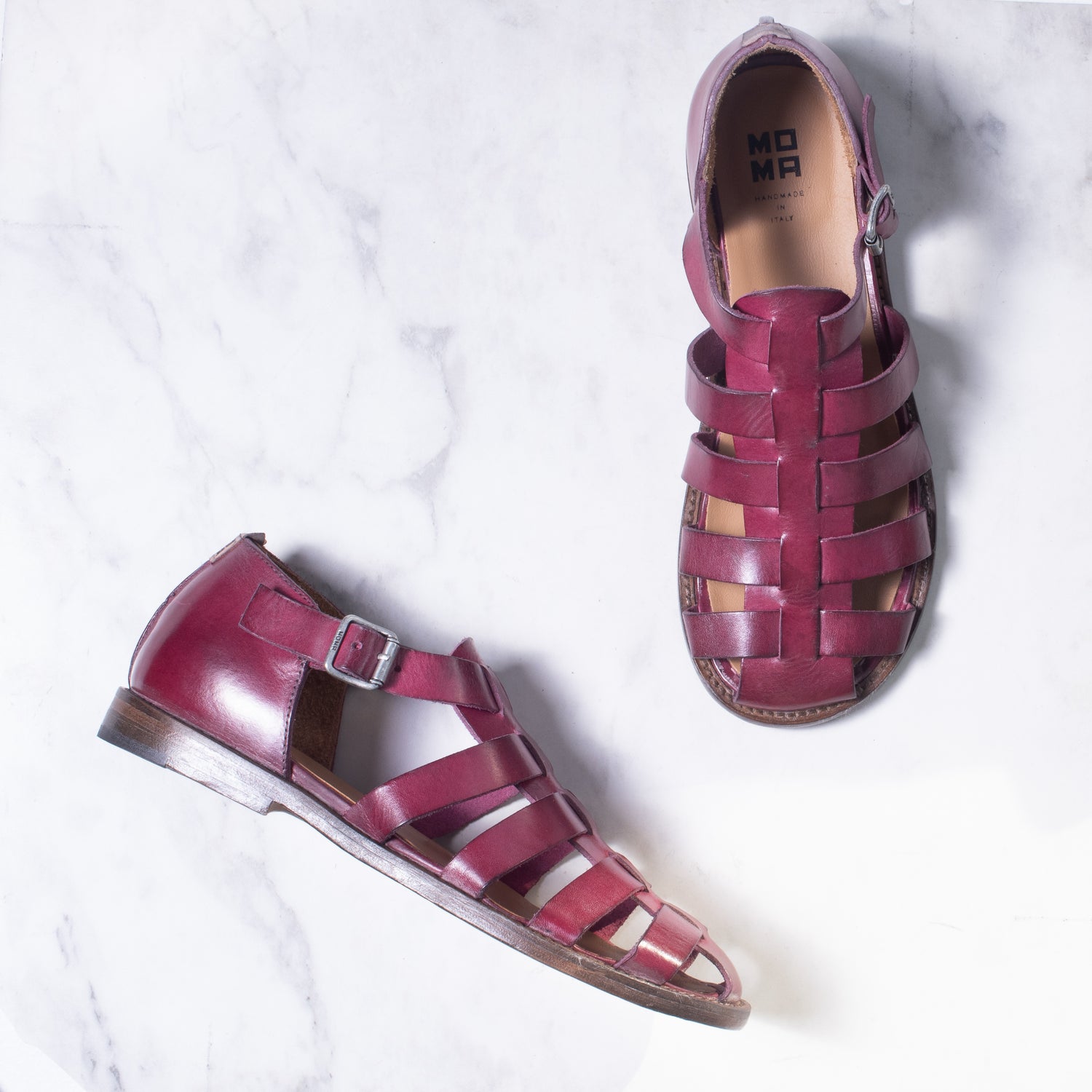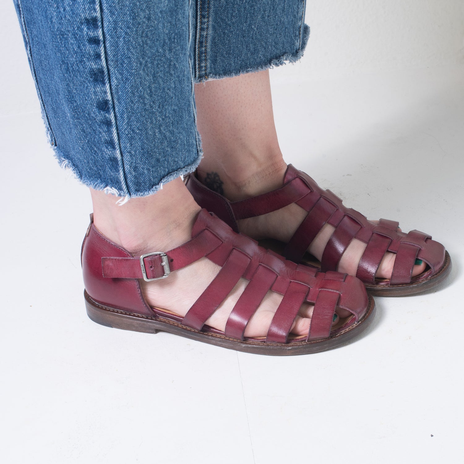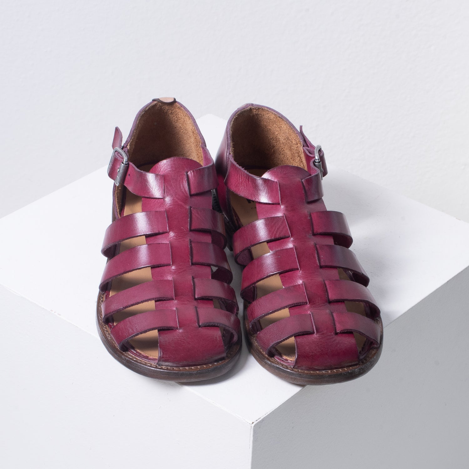 A classic fisherman style sandal in buttery cranberry leather. All leather stitched construction with partial rubber sole and heel strike for durable wear. Adjustable ankle strap.