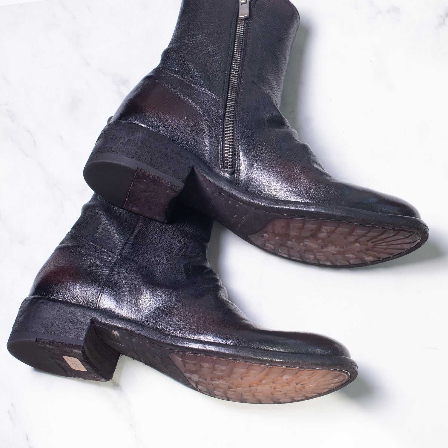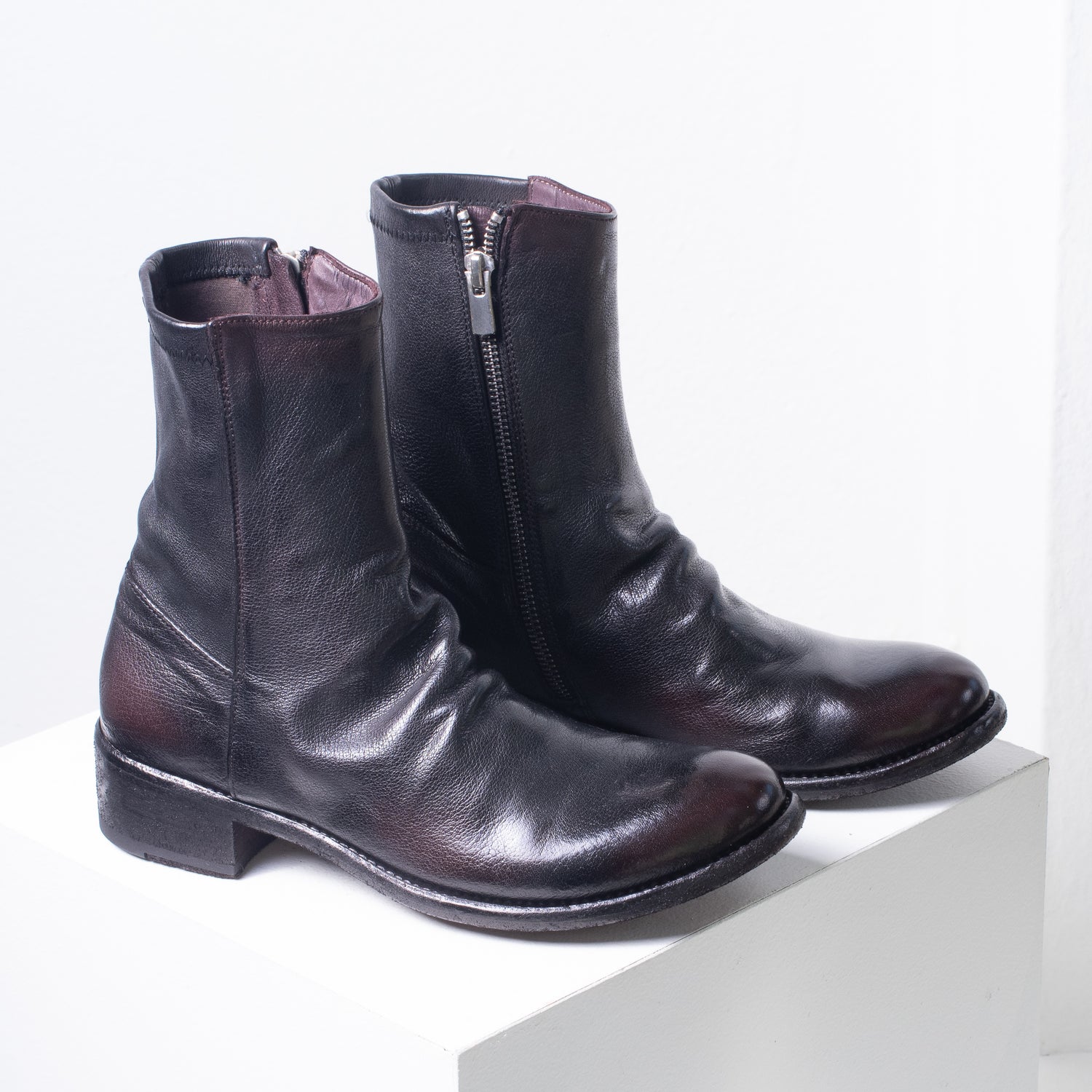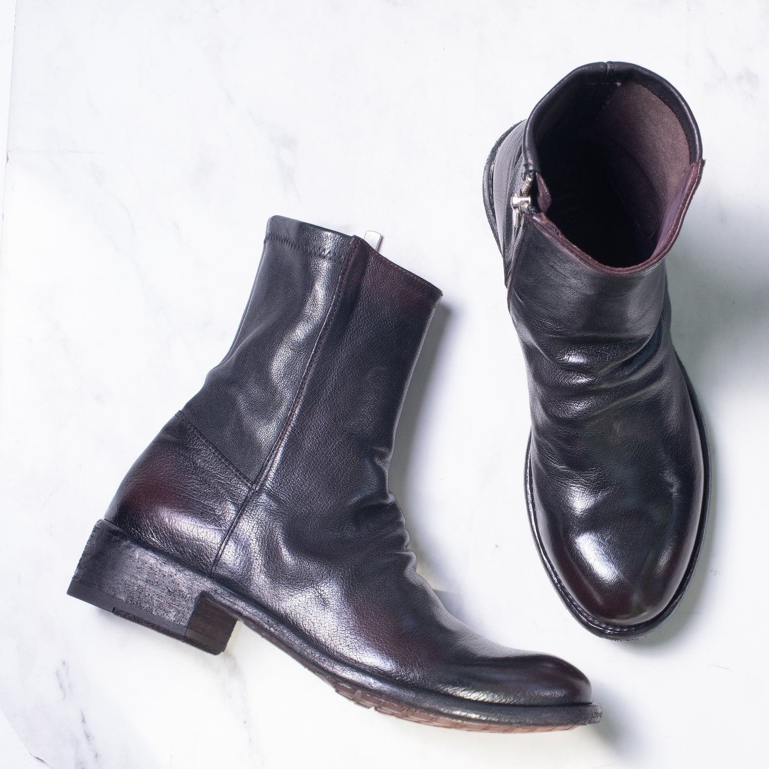 A shop favorite mid calf boot from Officine Creative. The Lison features a rounded toe, side zip and walk all day 1.5" stacked leather heel and heavy rubber tread sole. Constructed in the most subtle and gorgeous dark dark wine toned leather with black low lights. Shaft is 7" high and has an elasticized leather panel for a sexy silhouette. Lovely with trousers, jeans and dresses alike.