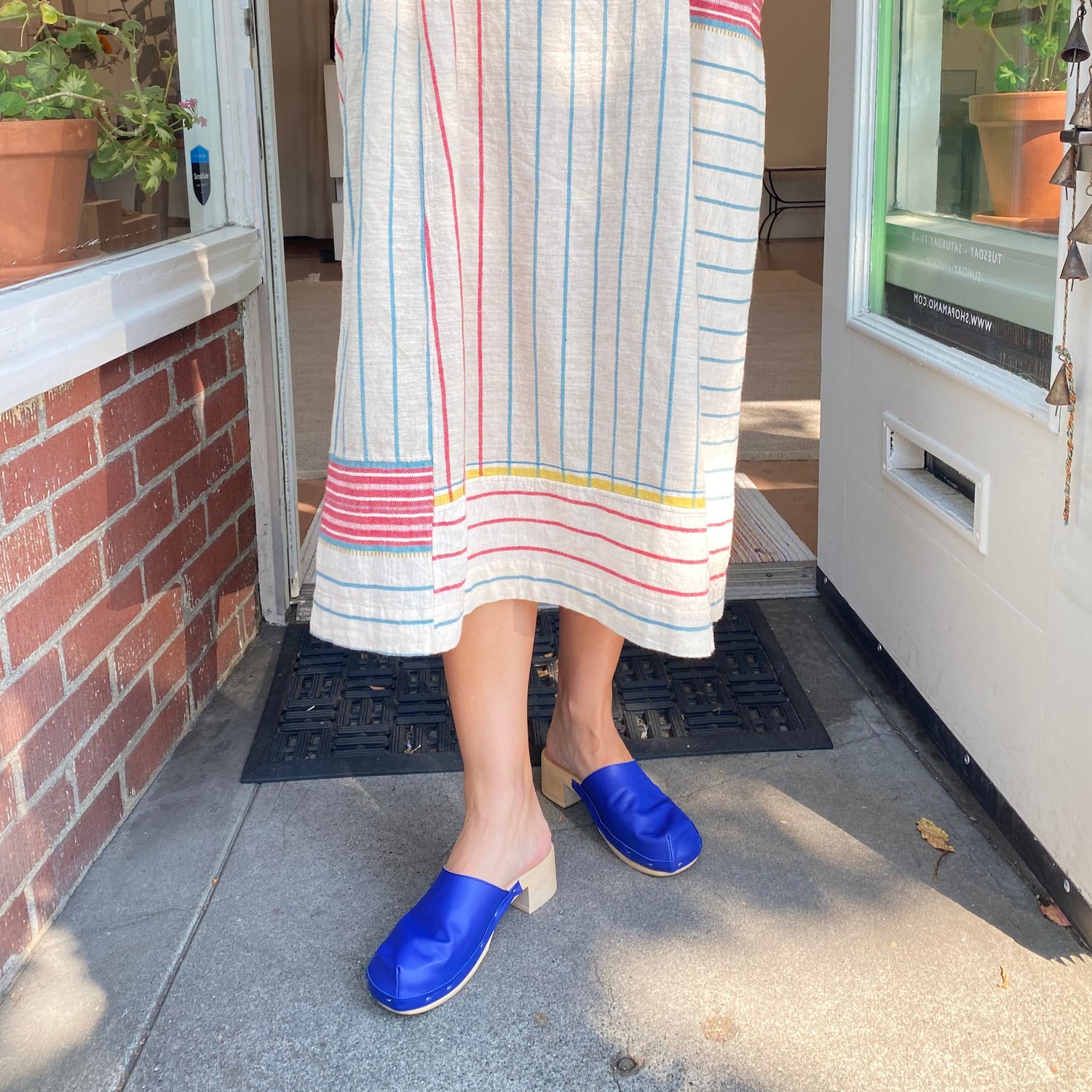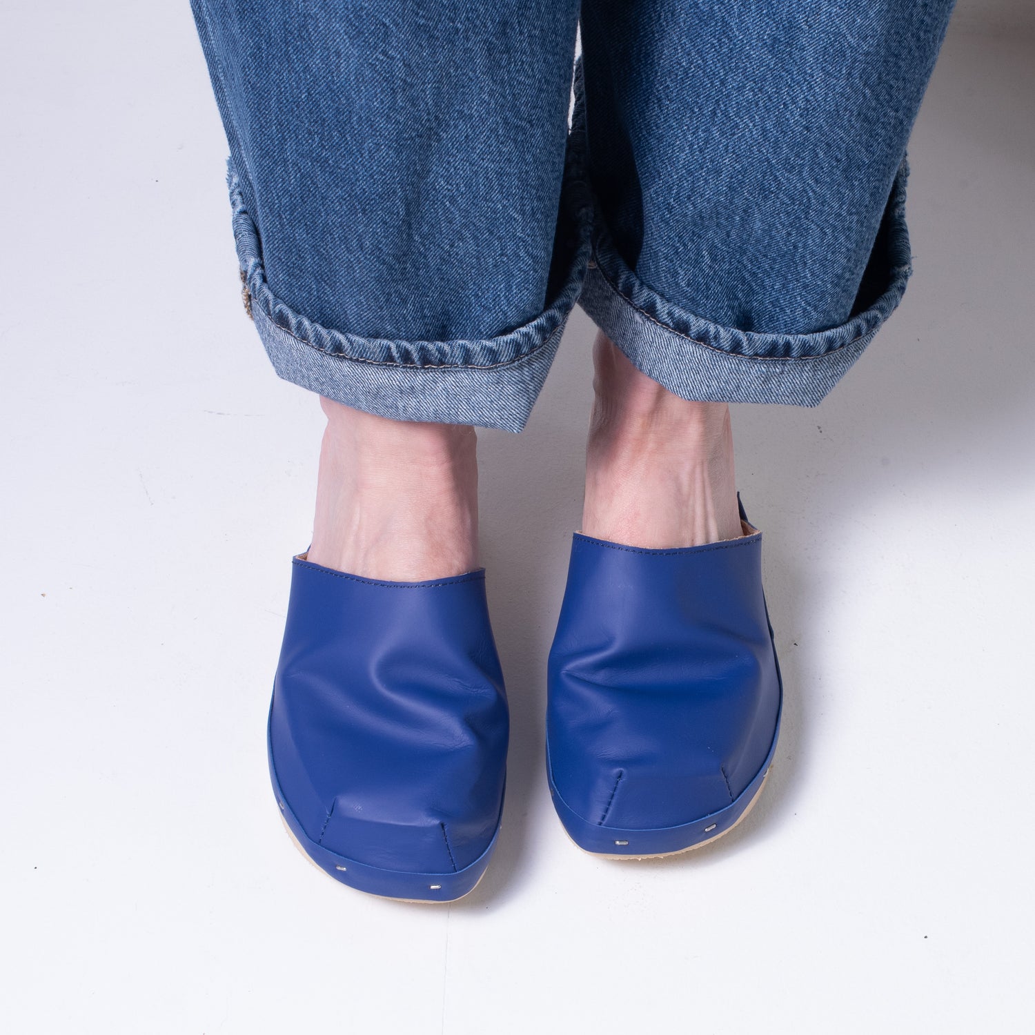 Insanely comfy and fun clogs made in vibrant and soft blue leather.  Distinctly lightweight and flexible construction features contoured wood with rubber inset under ball of foot that gives just the right amount of flex and support. Rubber sole keeps these quiet and cushioned.  2"heel with 1.5" platform is  pitch perfect. Wear with everything!