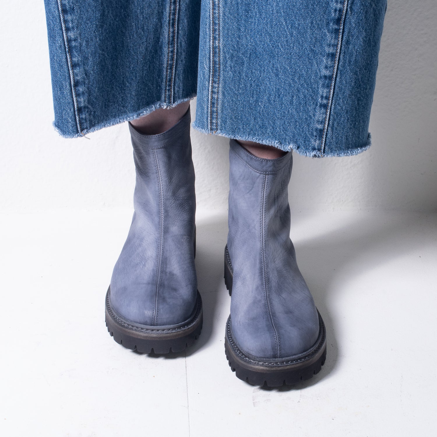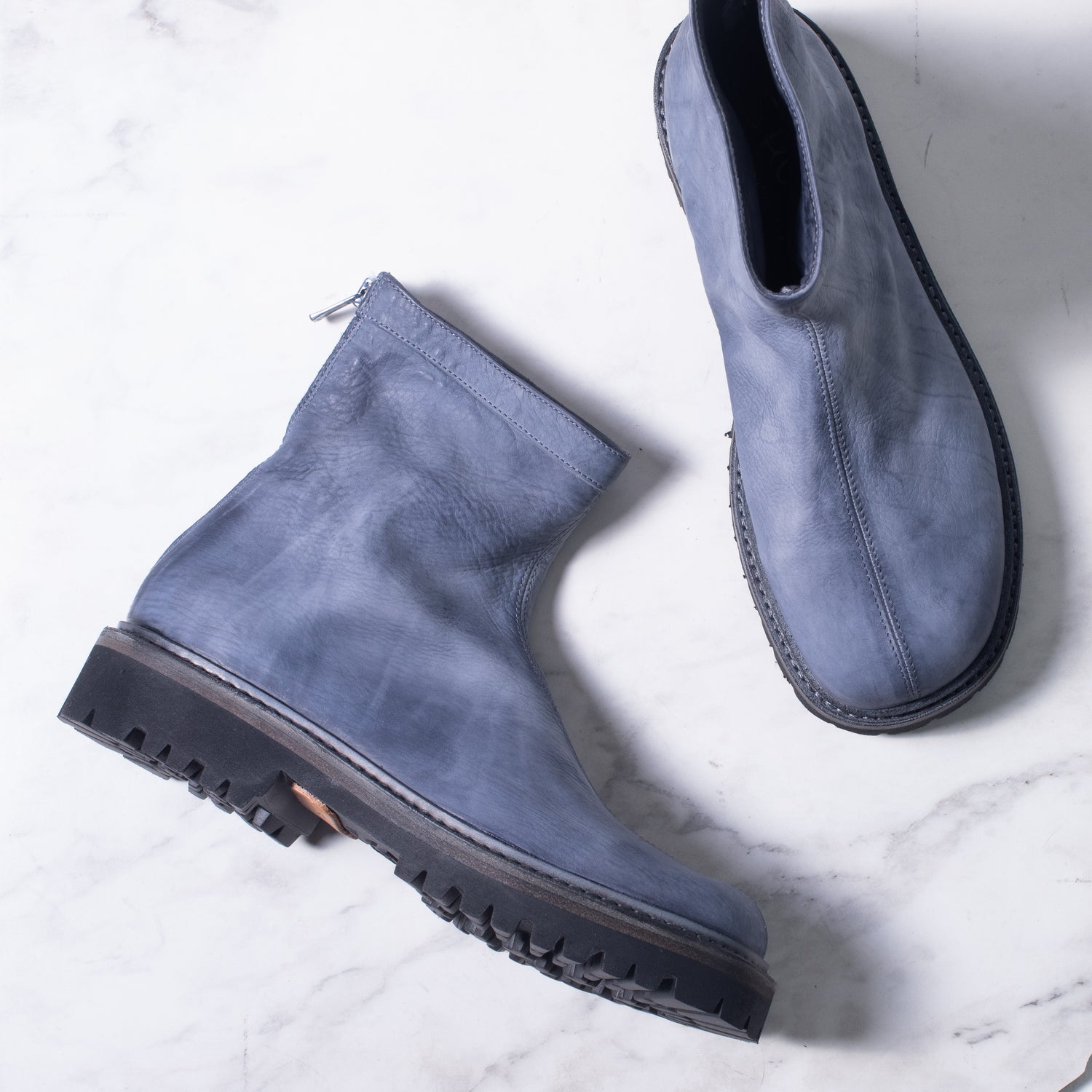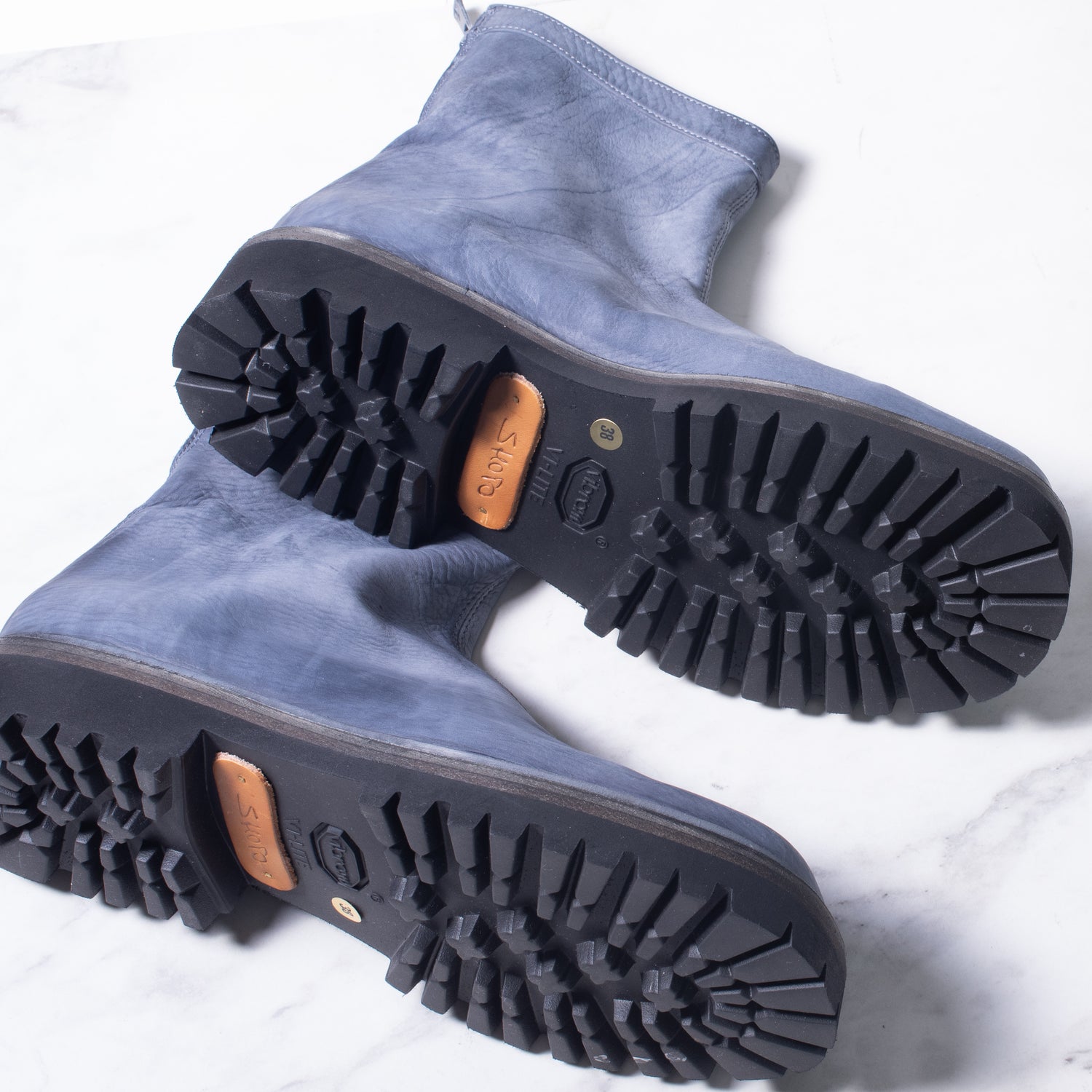A chunky, yet lightweight ankle boot in gorgeous washed and irregular toned navy blue nubuck leather. Zips up the back. All leather stitched construction with heavy vibram tread and 1.5" heel. Removable slim insole.