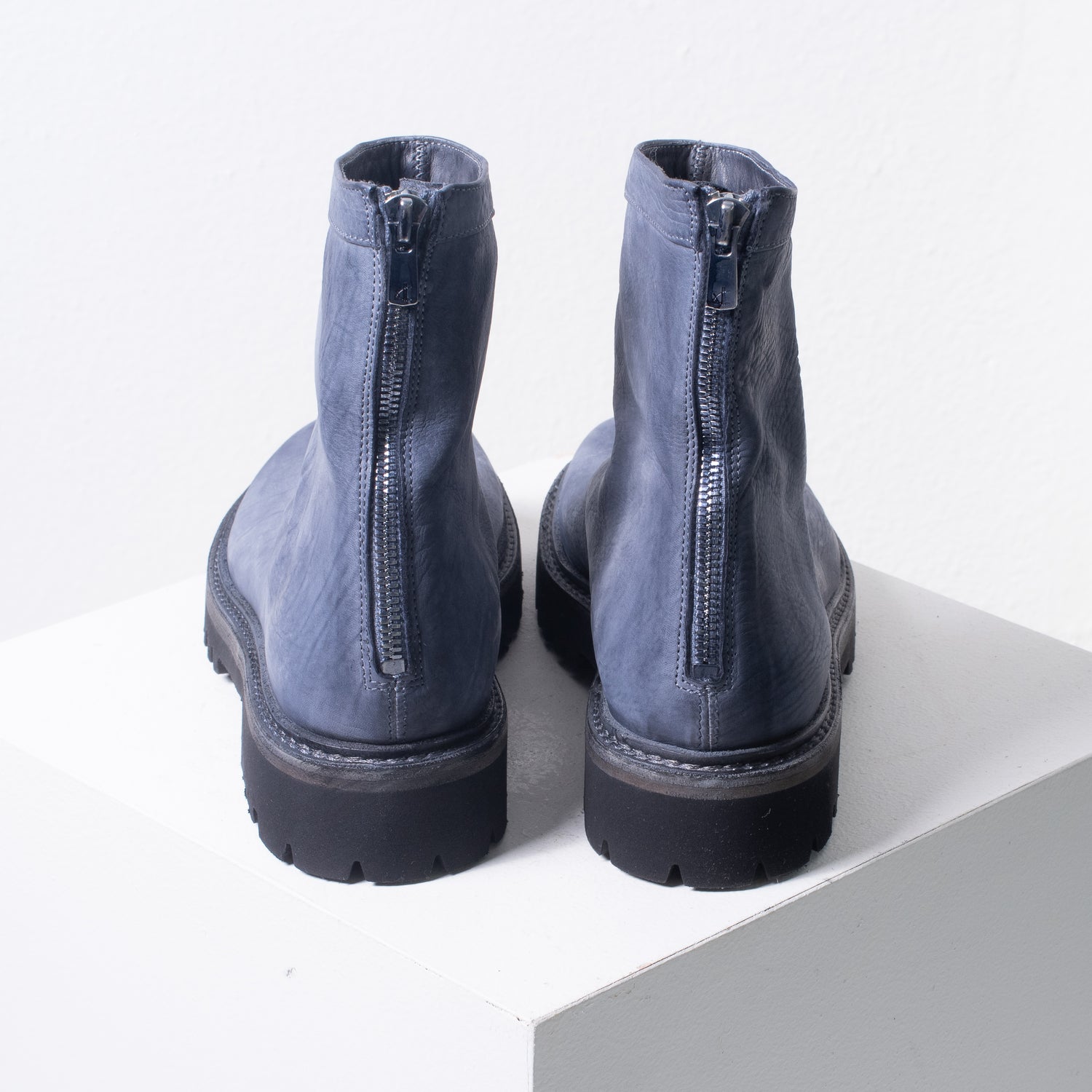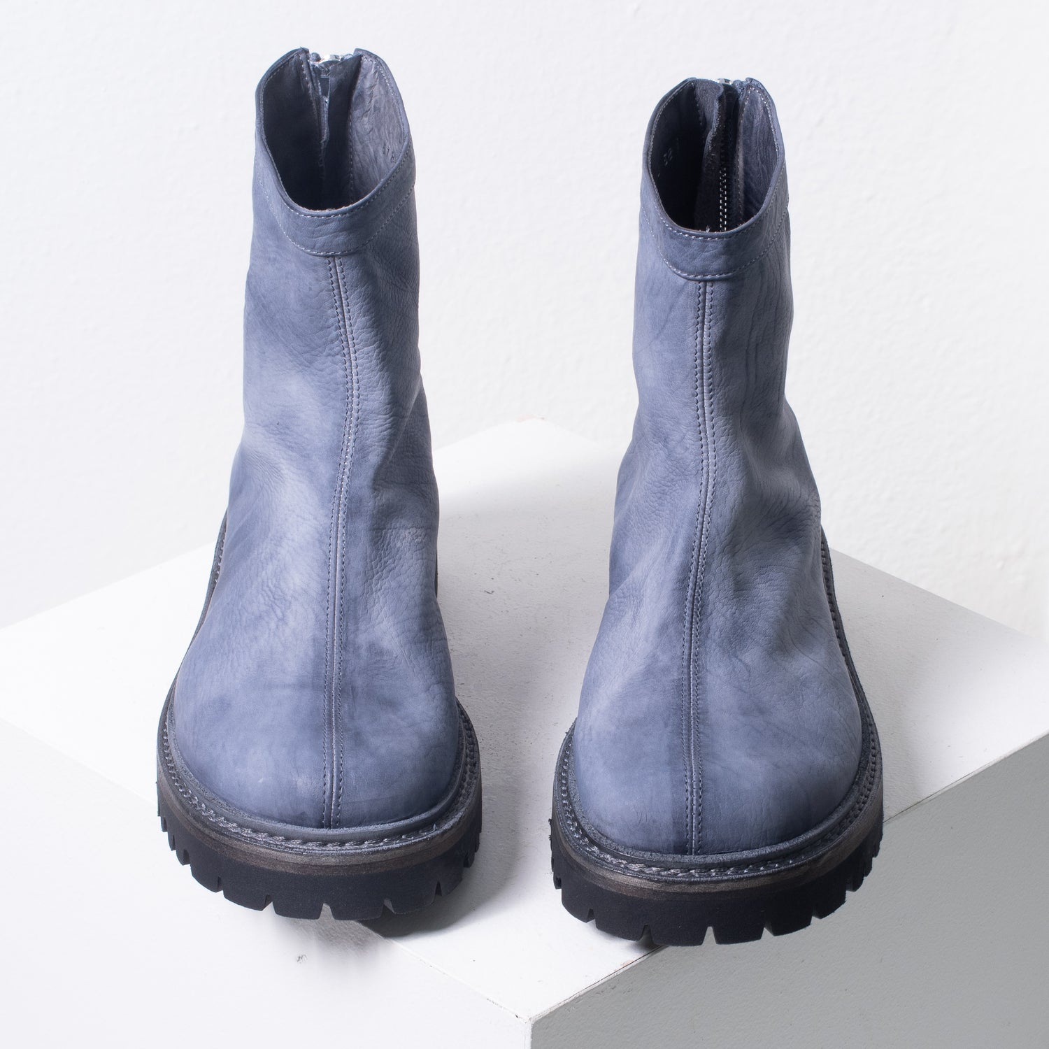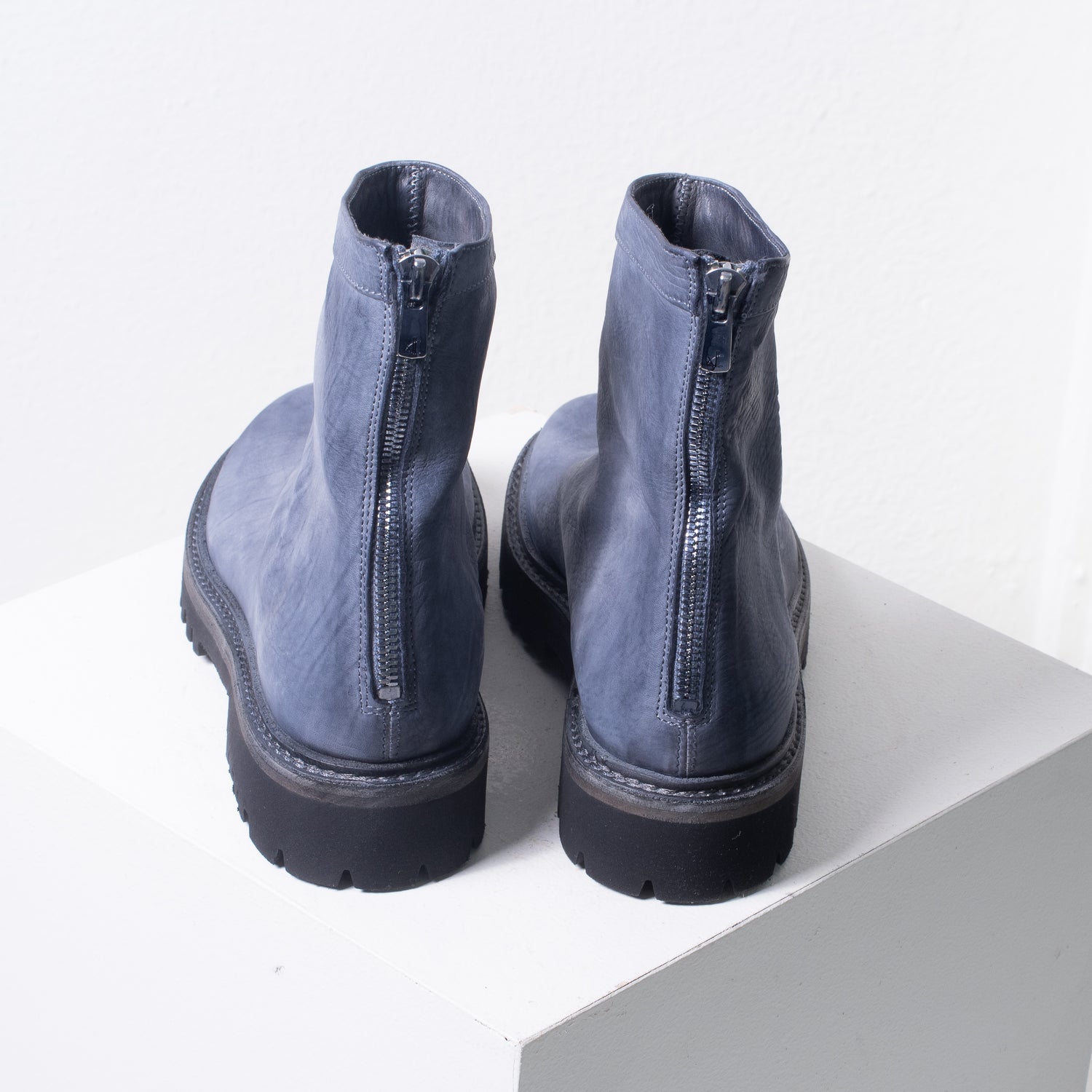 A chunky, yet lightweight ankle boot in gorgeous washed and irregular toned navy blue nubuck leather. Zips up the back. All leather stitched construction with heavy vibram tread and 1.5" heel. Removable slim insole.
