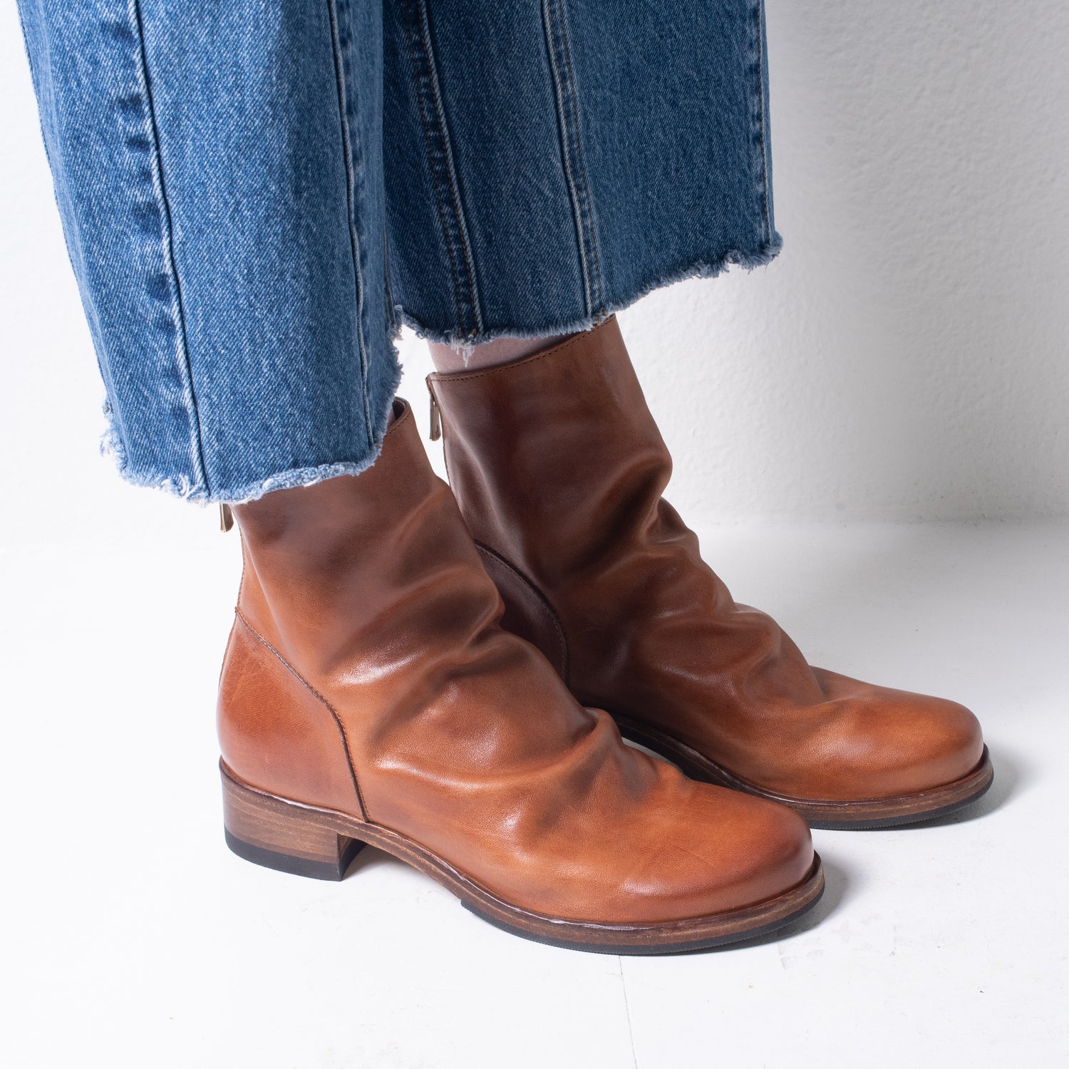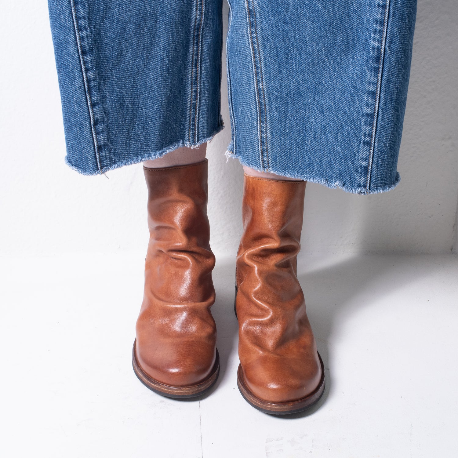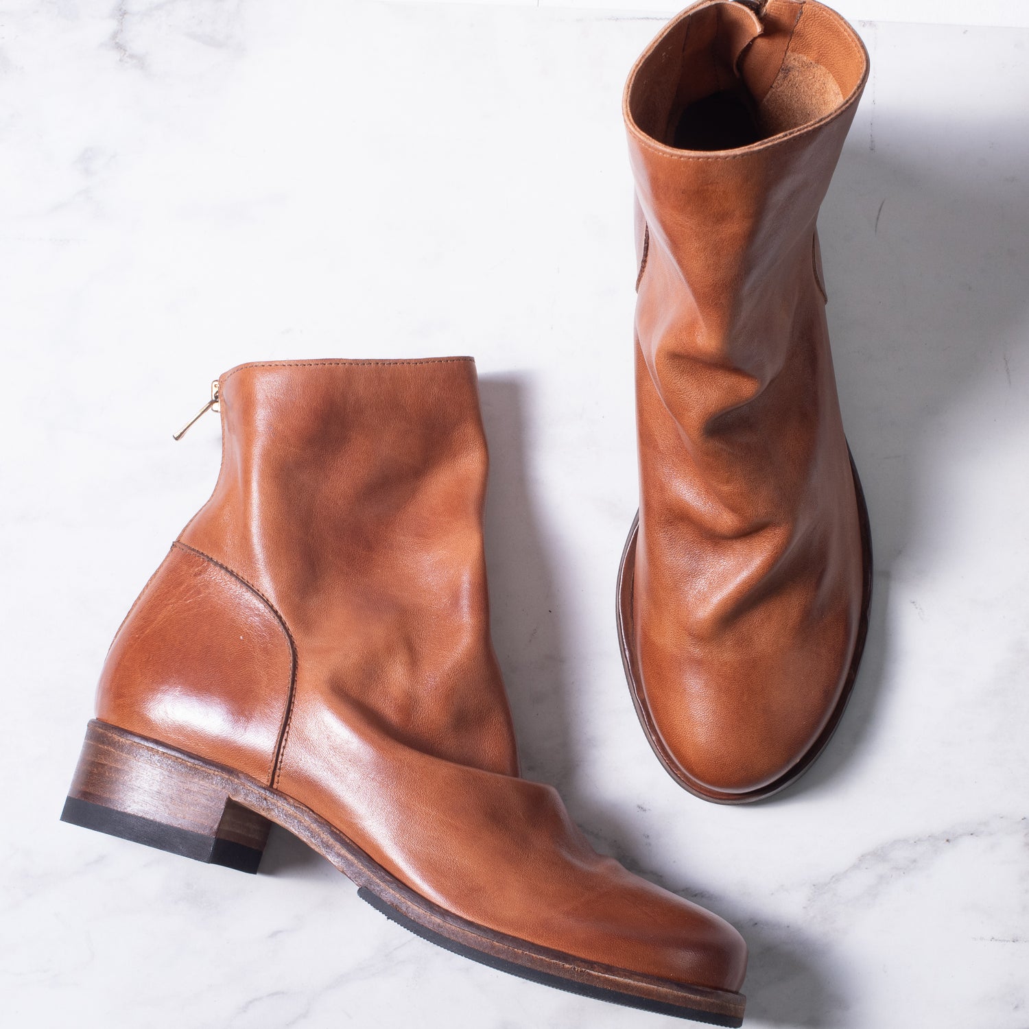 A timeless mid calf boot with rich buttery cognac leather and easy 1.5" stacked heel. Rounded toe.  All leather stitched construction with thin rubber sole for durable all season wear. Removable slim insole.  Zips up the back with a 5.5 " shaft.