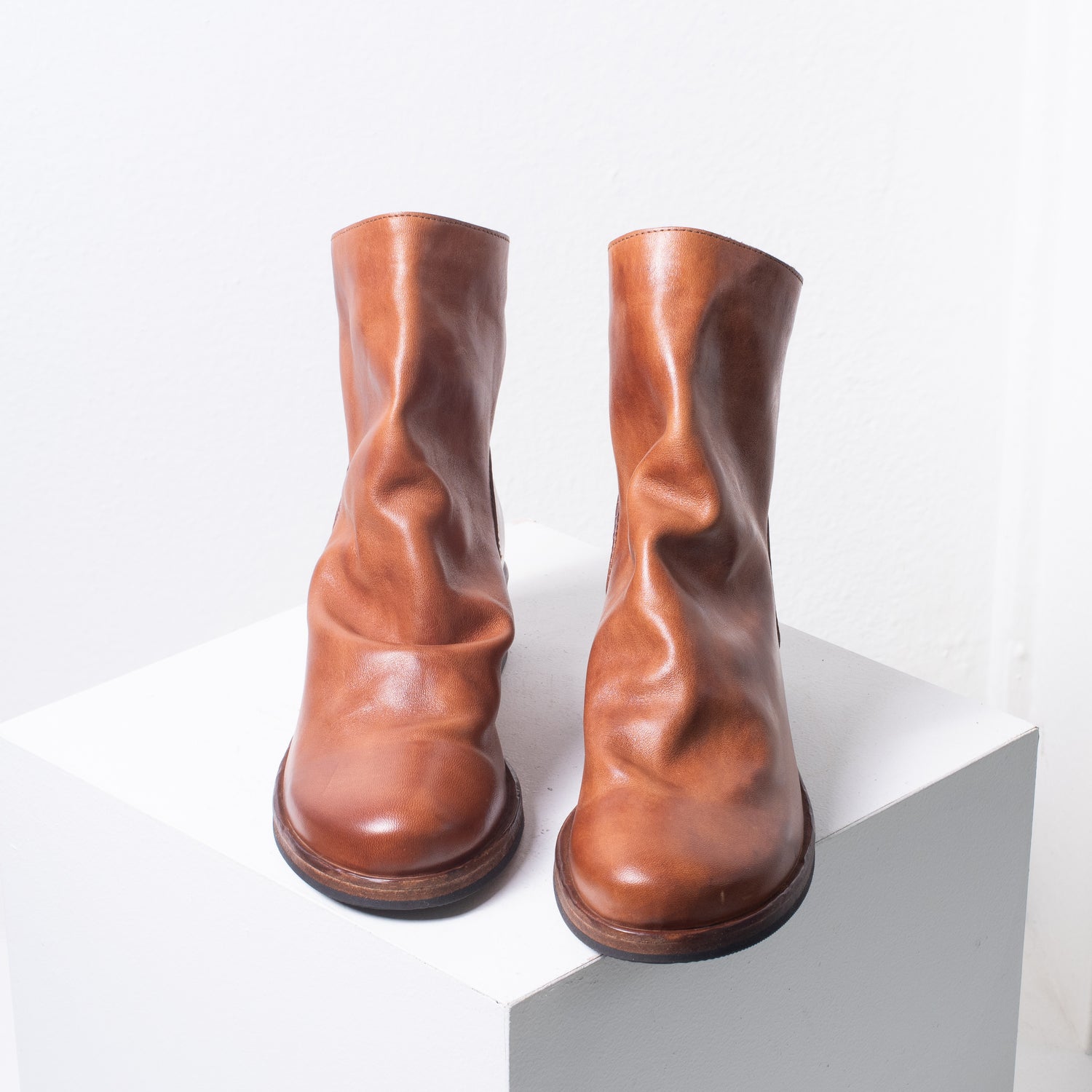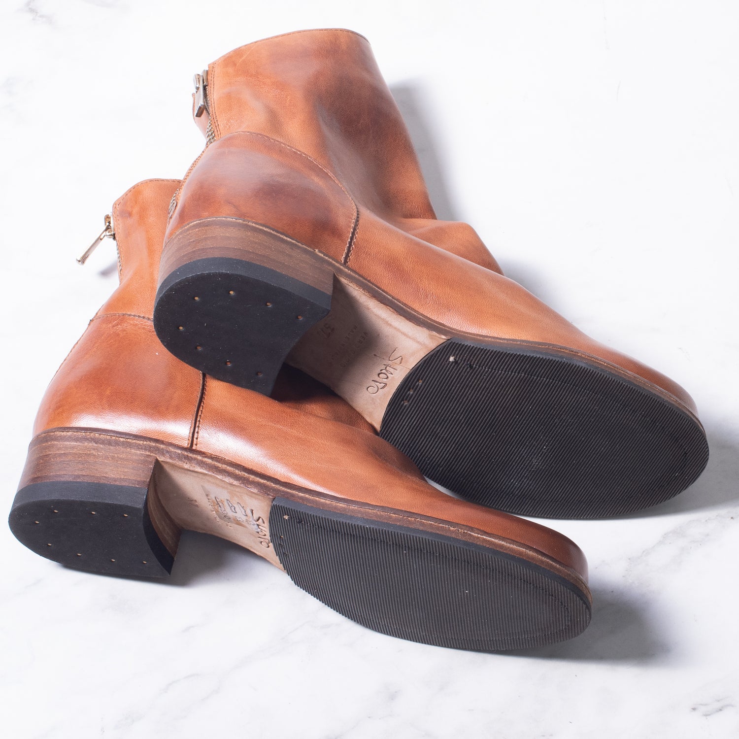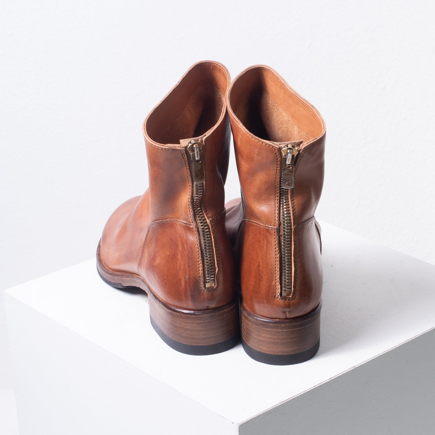 A timeless mid calf boot with rich buttery cognac leather and easy 1.5" stacked heel. Rounded toe.  All leather stitched construction with thin rubber sole for durable all season wear. Removable slim insole.  Zips up the back with a 5.5 " shaft.