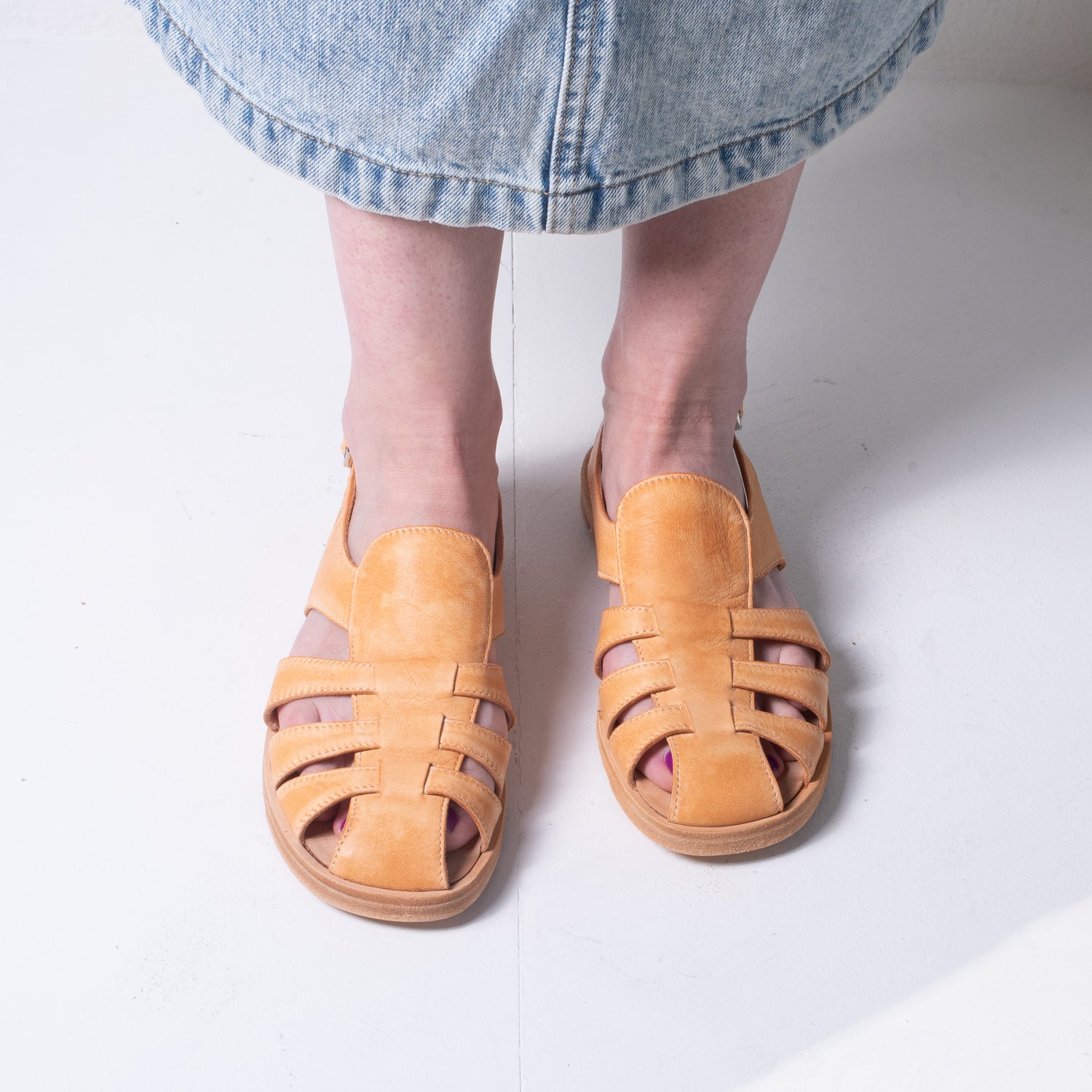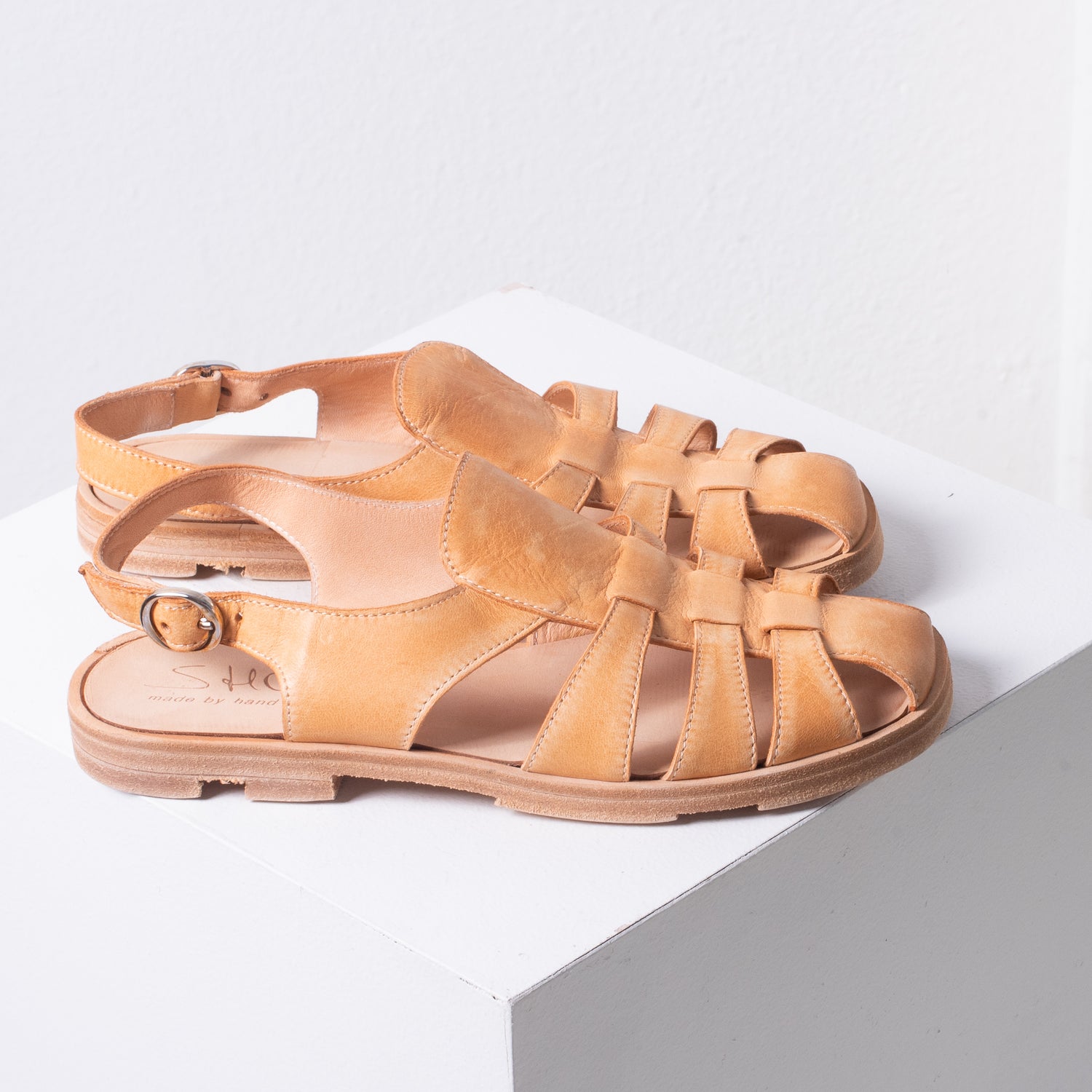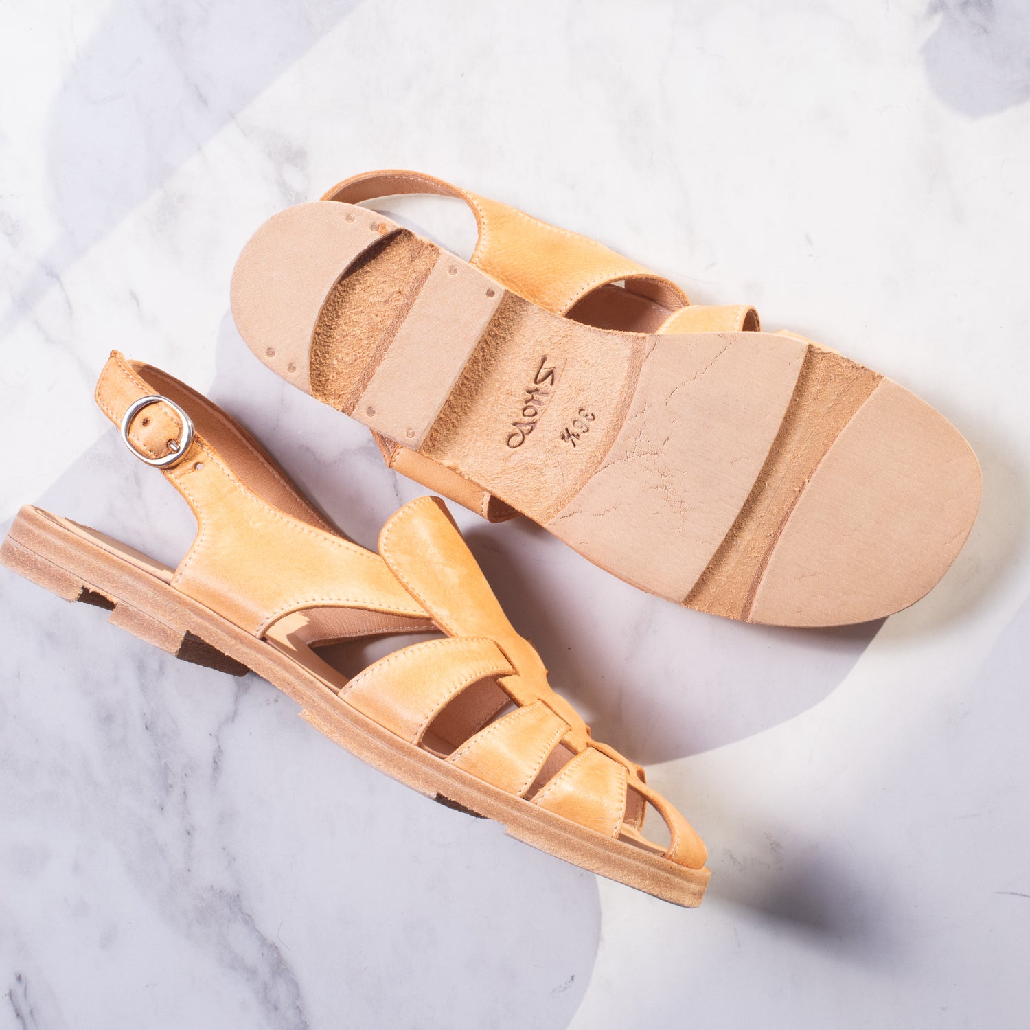 Timeless, and versatile sandal featuring Shoto's signature buttery, washed and irregular toned leather with woven upper and adjustable sling back strap. Rounded toe. All leather construction with ridged leather sole. Hits the perfect balance of an open, breezy sandal with a little more coverage for those urban walks. Easy straight fit.