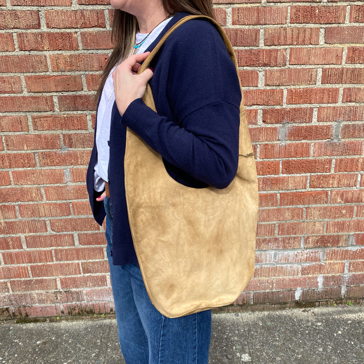A new slouchy medium sized shoulder bag featuring Shoto's sumptuous washed leather. Lightweight and strong this bag measures approximately 11"H, 11"W, and 6"D and sits comfortable on the shoulder with soft wide strap. Shoulder drop is 15". Zipper main entrance with 2 open interior pockets and matching calf leather lining. Wow!