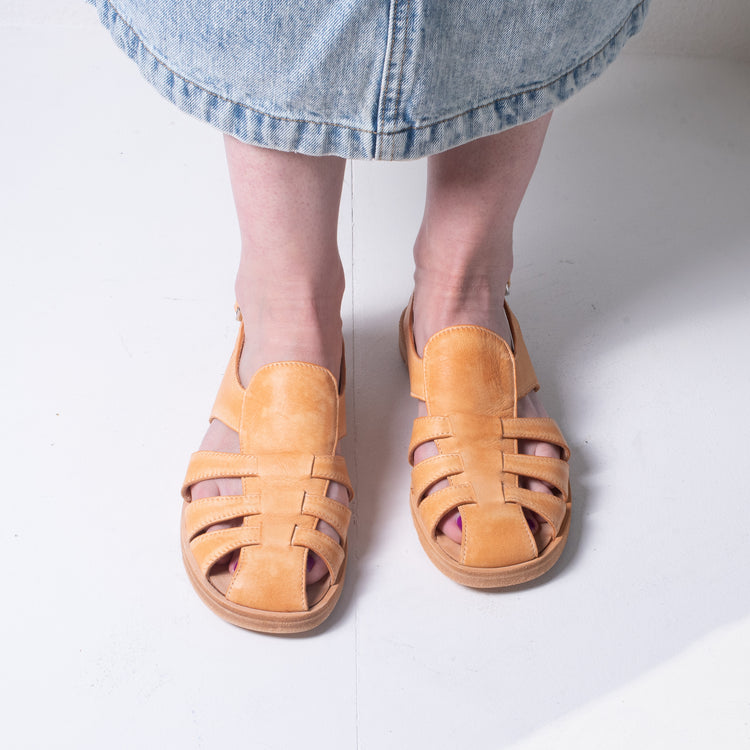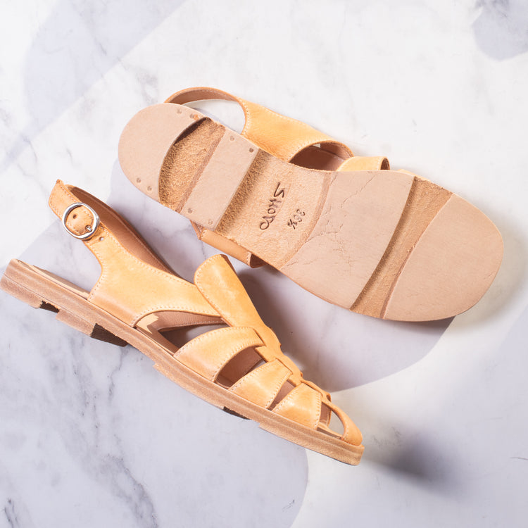 Timeless, and versatile sandal featuring Shoto's signature buttery, washed and irregular toned leather with woven upper and adjustable sling back strap. Rounded toe. All leather construction with ridged leather sole. Hits the perfect balance of an open, breezy sandal with a little more coverage for those urban walks. Easy straight fit.