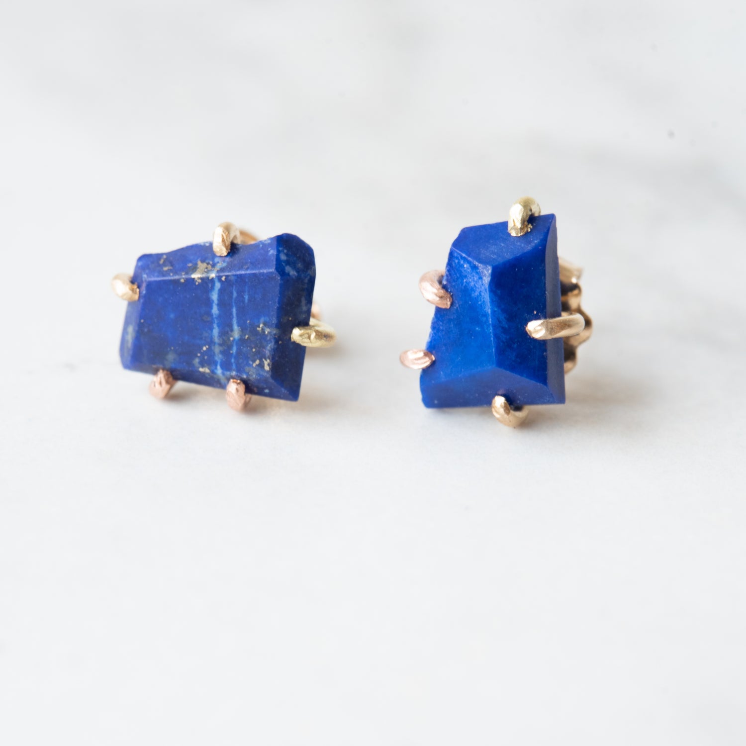 Hand cut and asymmetric medium sized Lapis stud earrings set in 14k gold prongs and ear wire. Wonderful, rich saturated blue!