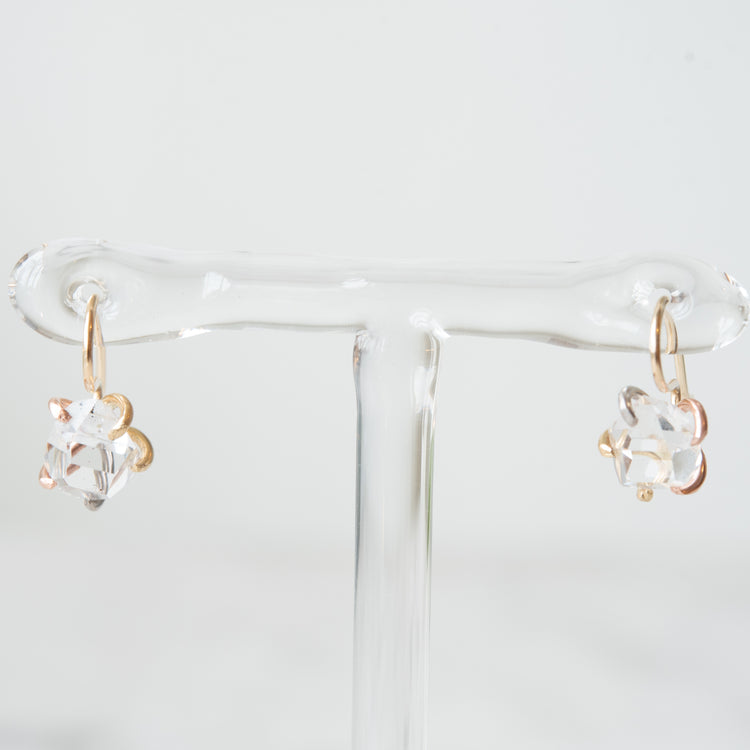 Medium, hand cut and asymmetric Herkimer Quartz earrings set in 14k yellow, rose and white gold prongs and ear wire. Catches the light just so.
