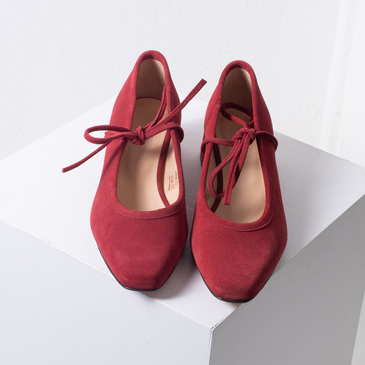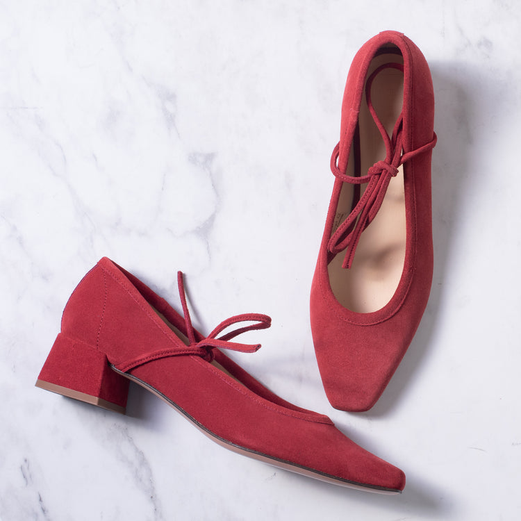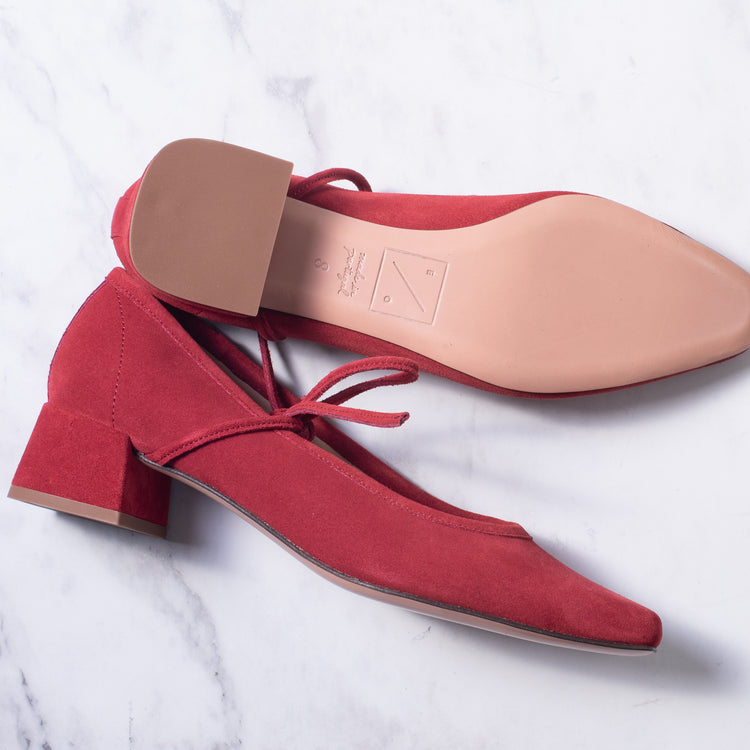 Thoughtful and modern mid heel ballet crafted with rich suede. We love the charming tie, that holds your foot just so and the sculptural 1.5" suede covered heel.  Leather lined and leather sole with partial rubber heel strike for durable wear. So pretty on! Dress it up or down, this is a versatile charmer that goes with everything. A shop favorite!