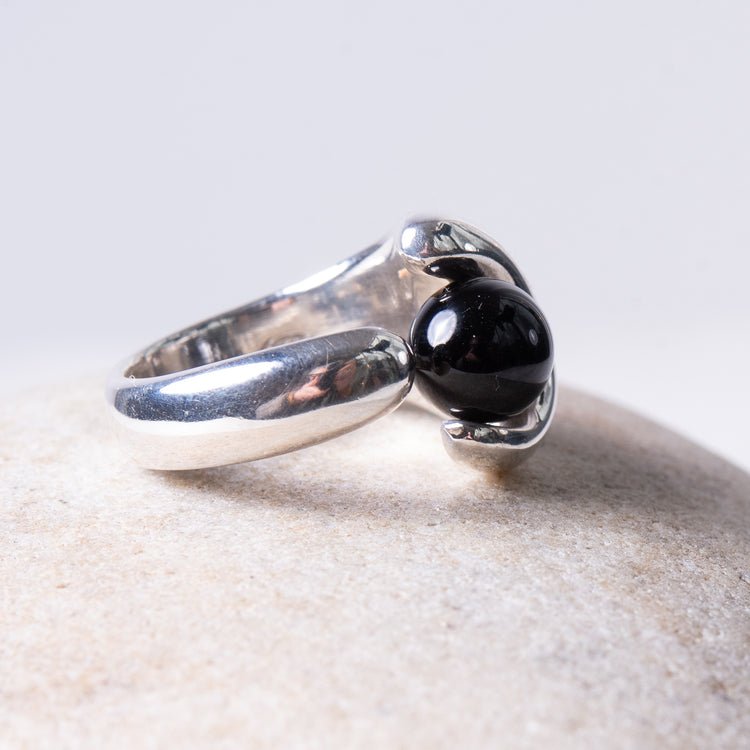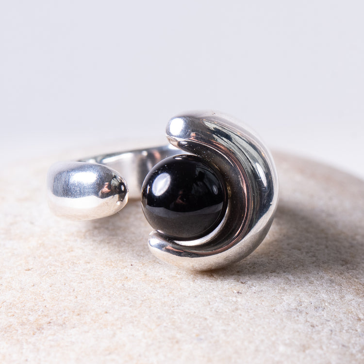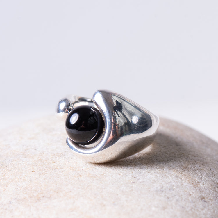 Deeply rooted in modern Milanese design, Monica Castiglioni creates this stunning organic piece in sterling silver. The Perle is a more substantial open designed ring with one single onyx stone. Like good leather, the work patinas beautifully and ages gracefully and feels very organic and grounding on. All her work is nickel free. Substantial, modern/ primitive sculpture you get to wear. We can't get enough!
