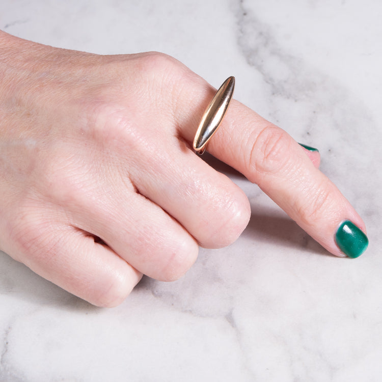 Deeply rooted in modern Milanese design, Monica Castiglioni creates this stunning organic piece in solid bronze. The Semini is a slim, horizontal oriented ring.  Like good leather, the work patinas beautifully and ages gracefully and feels very organic and grounding on. All her work is nickel free. Substantial, modern/ primitive sculpture you get to wear. We can't get enough!