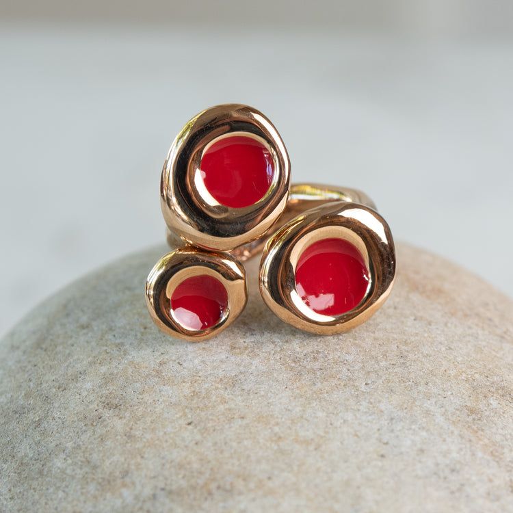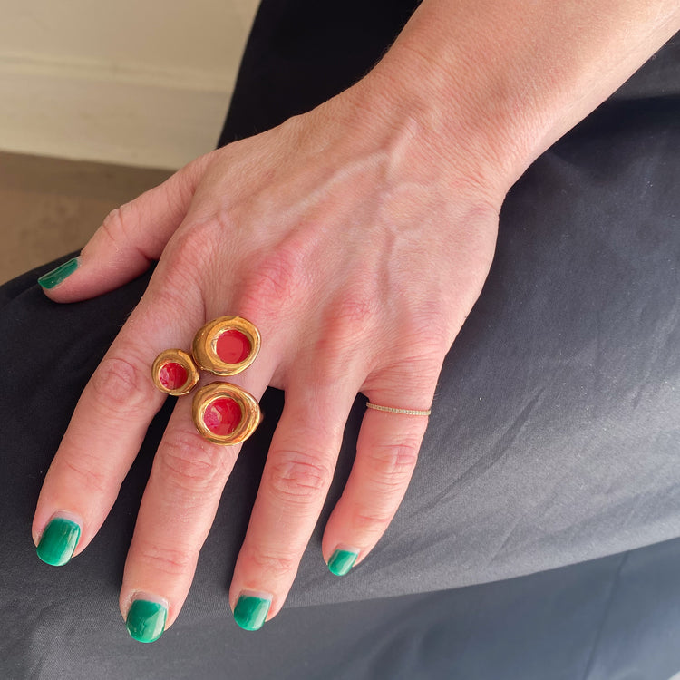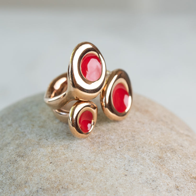 Deeply rooted in modern Milanese design, Monica Castiglioni creates this stunning organic piece in solid bronze with 3 concave pools of red enamel.  Like good leather, the work patinas beautifully and ages gracefully and feels very organic and grounding on. All her work is nickel free. Substantial, modern/ primitive sculpture you get to wear. We can't get enough!