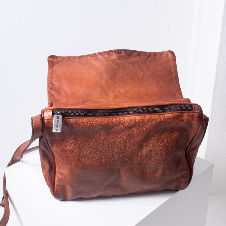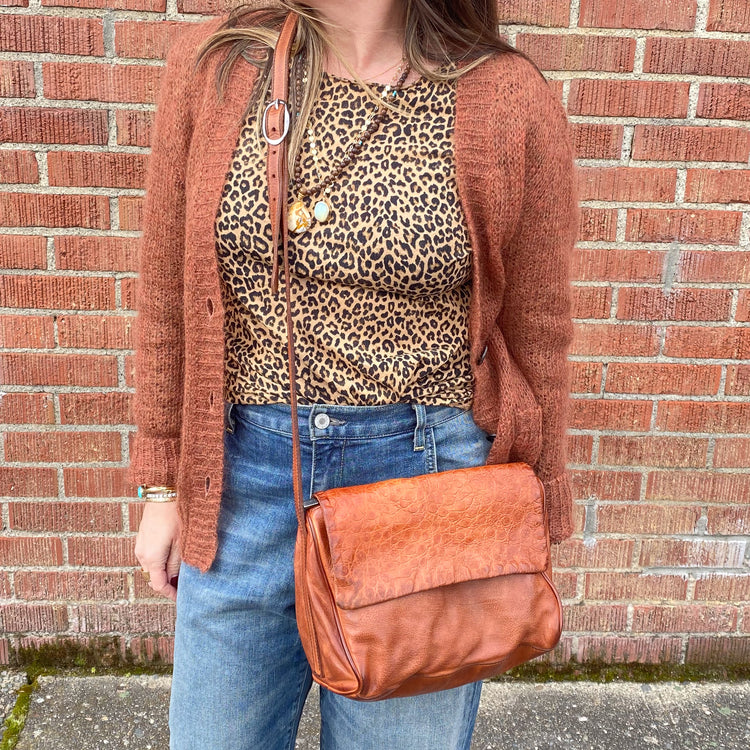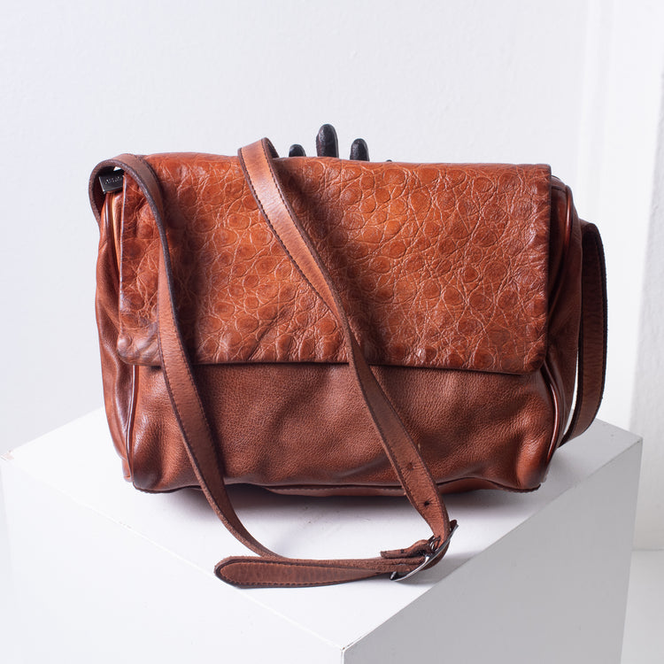 A super simple and elegant medium sized crossbody bag featuring supple and lightweight washed lamb leather. Top flap is made in a tone on tone embossed leather for distinctive look. Zip entrance under flap with black canvas lining and one zippered interior pocket. Adjustable shoulder strap. Measures approx. 7"H, 9.5"W and 4.25"D. Fortified bottom for this soft bag is perfect.