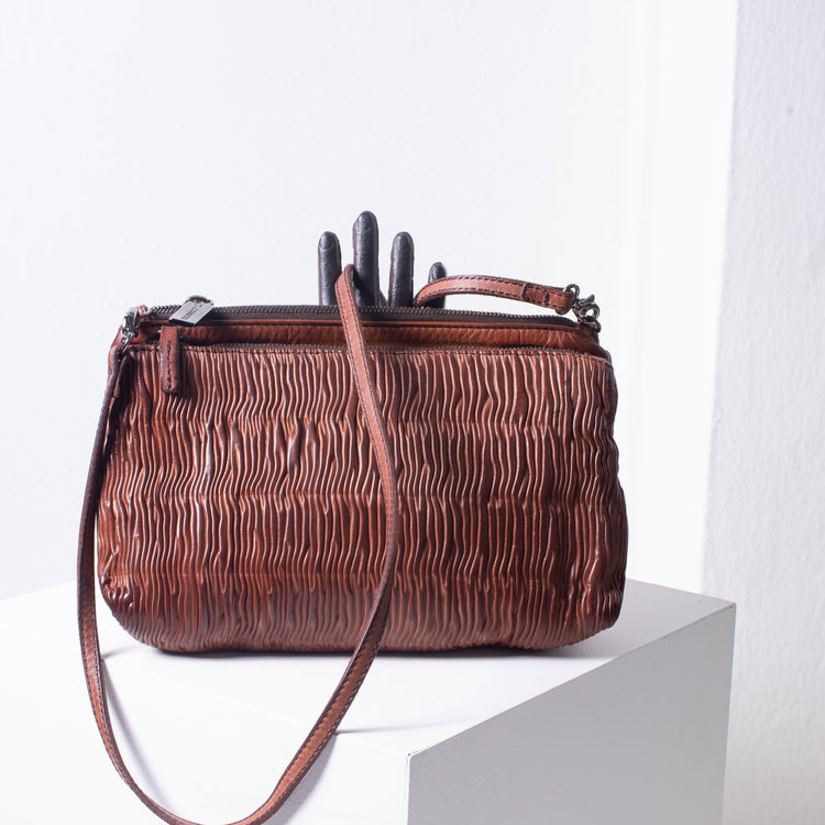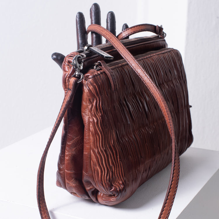 A shop favorite cross body bag features distinctive folded lamb leather on face. Can be worn long with adjustable shoulder strap, or strap can be removed and worn as a clutch. Unique double zip design holds more than you would think! Interior is lined in matching calf leather. Measures approx. 8"H, 10.25" W, 3"D.  Lightweight, distinctive, and versatile!