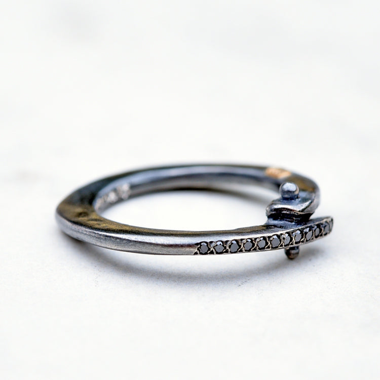 Slim oxidized silver ring featuring 12 tiny (.14cts) Black Diamonds along one side.  Stacks well with other Sayuri pieces from her collection or maybe something from yours. Available is size 6.5 and 7.5.