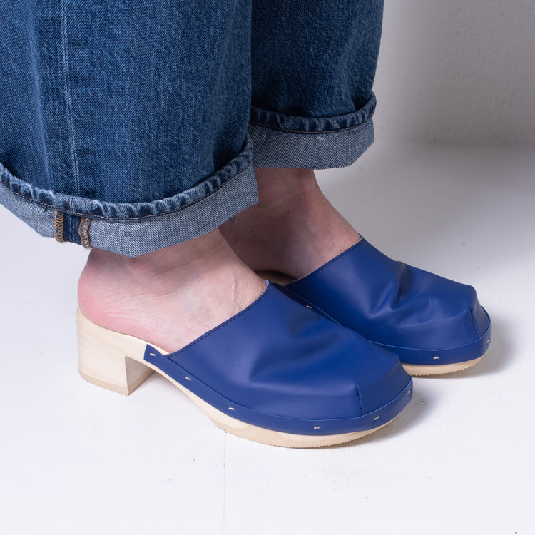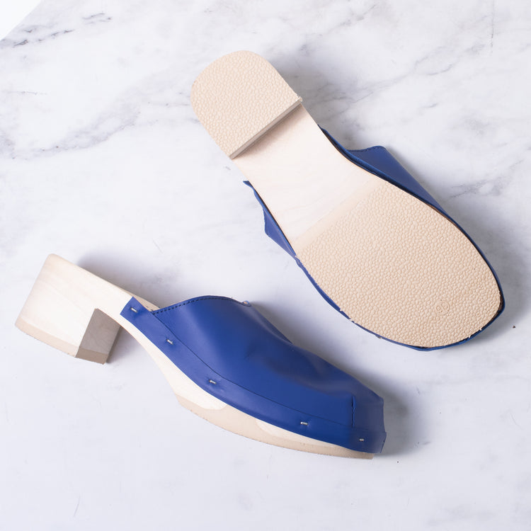 Insanely comfy and fun clogs made in vibrant and soft blue leather.  Distinctly lightweight and flexible construction features contoured wood with rubber inset under ball of foot that gives just the right amount of flex and support. Rubber sole keeps these quiet and cushioned.  2"heel with 1.5" platform is  pitch perfect. Wear with everything!