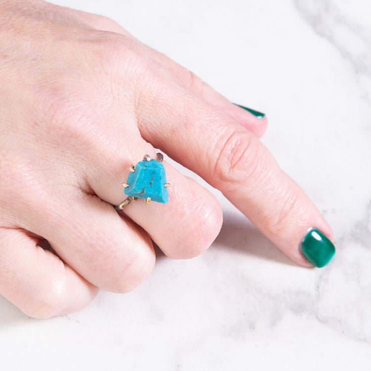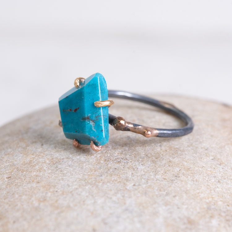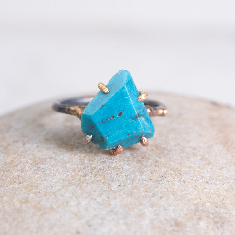 Hand cut Arizona turquoise ring in saturated turquoise tones.  It is held with 14k rose, white, and yellow gold claws and sits on an oxidized silver band with 14k-24k gold embedded in it to organic effect. Size 6.5, but can be resized for a small fee.