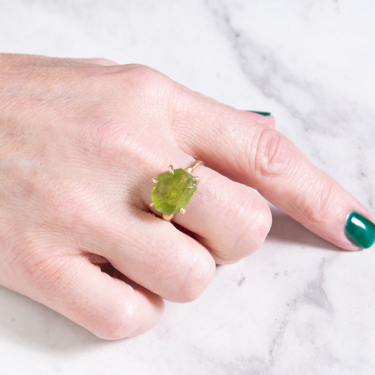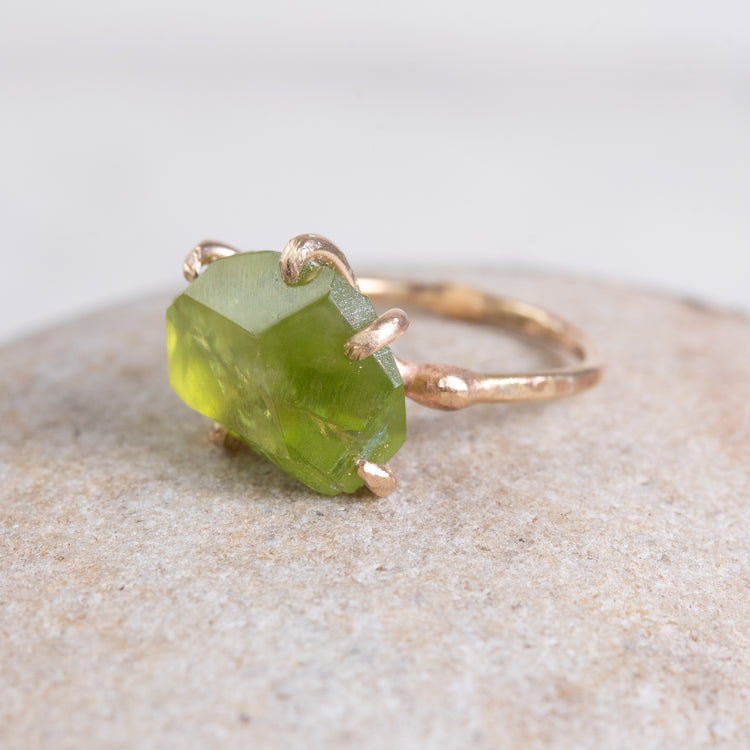 Medium/large, hand cut peridot ring. Stone is set in 14k gold prongs and band. Catches the light just so. Size 7, can be resized for a small fee.