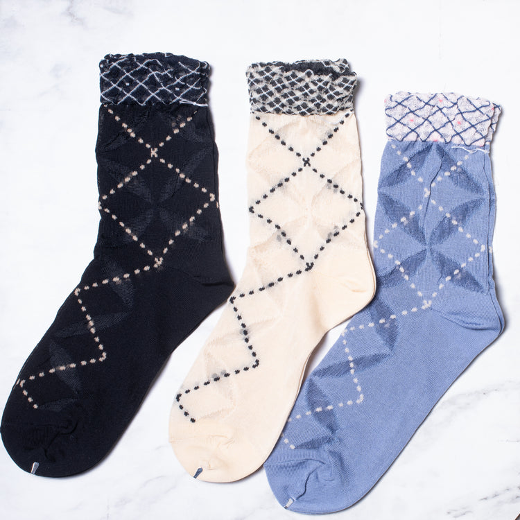 Intricate, and elaborately detailed socks from Antipast Socks of Japan. The "Sheer Argyle" features a thin, trouser length cotton nylon blend sock with graphic semi sheer argyle pattern and contrasting top.  Made of 70% cotton and 30% nylon.  These will fit a US woman's size 6.5-10 well. Handle with care. Hand wash warm and lay flat to dry for best results. Fun socks stimulate your appetite to dress, just like a good antipasto course before a great meal.