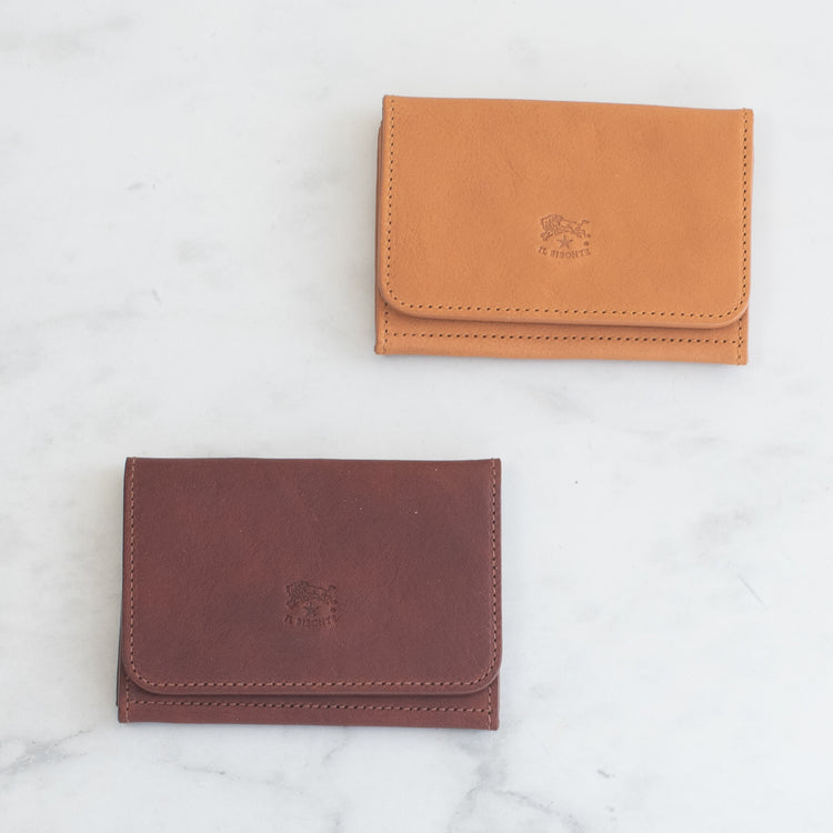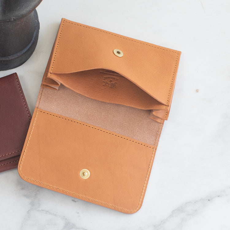 A minimalist and slim wallet. Snaps open to two open pockets. Fits easily in your pocket. Measures approx. 4.25"W, 3"W and .25"D. Available in vintage brown and natural tan.