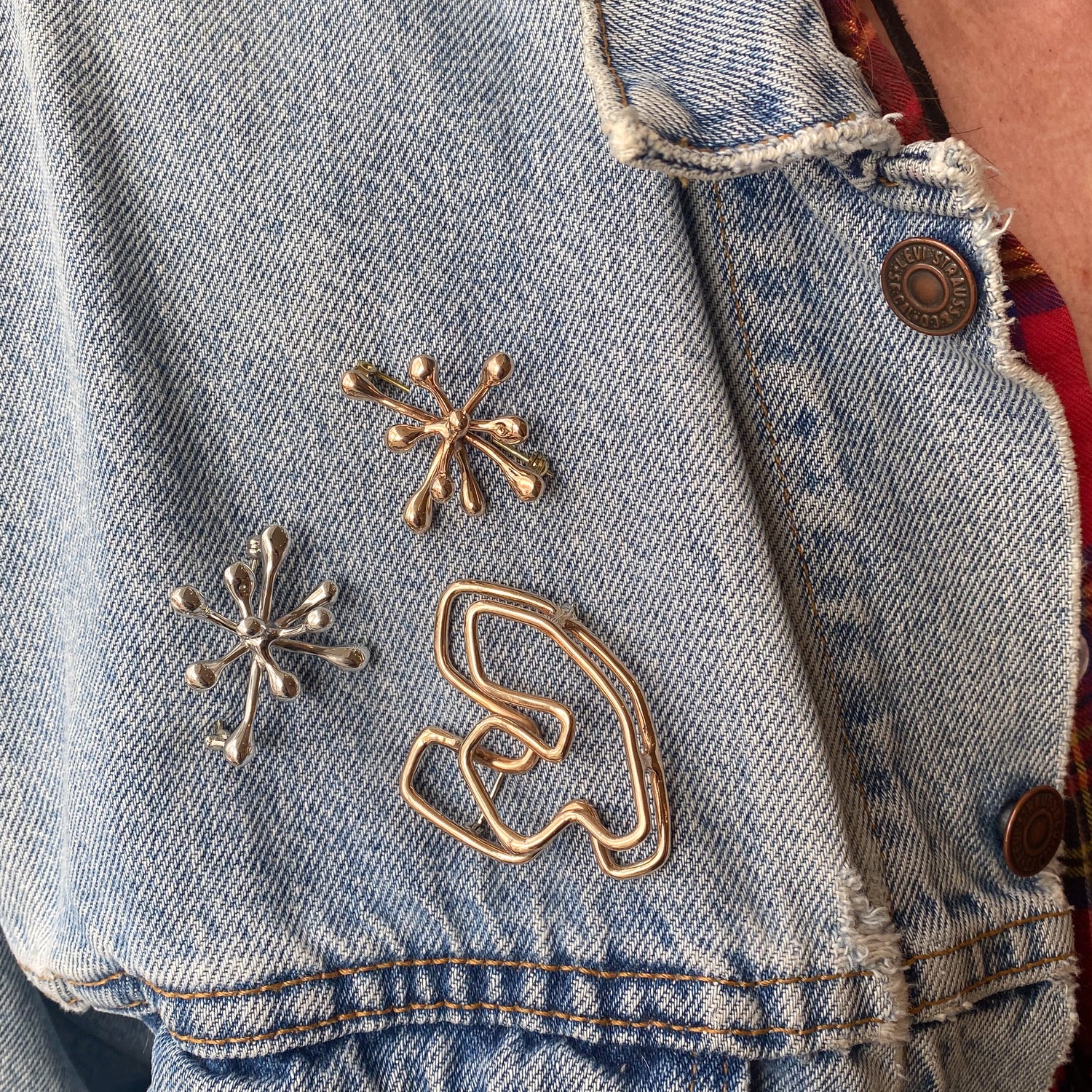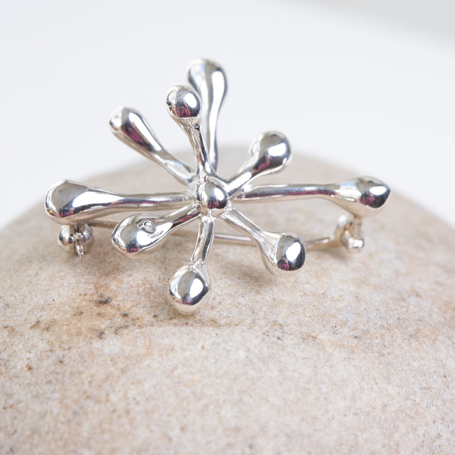 Deeply rooted in modern Milanese design, Monica Castiglioni creates stunning organic pieces in solid bronze and sterling silver. The Pistilli 18 is a sterling silver brooch, suggesting gathered botanical pistils. Medum/small brooch measures just under 2" across and 1.5"H.   Like good leather, the work patinas beautifully and ages gracefully and feels very organic and grounding on. All her work is nickel free. Substantial, modern/ primitive sculpture you get to wear. We can't get enough!