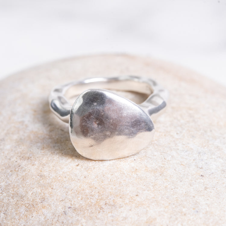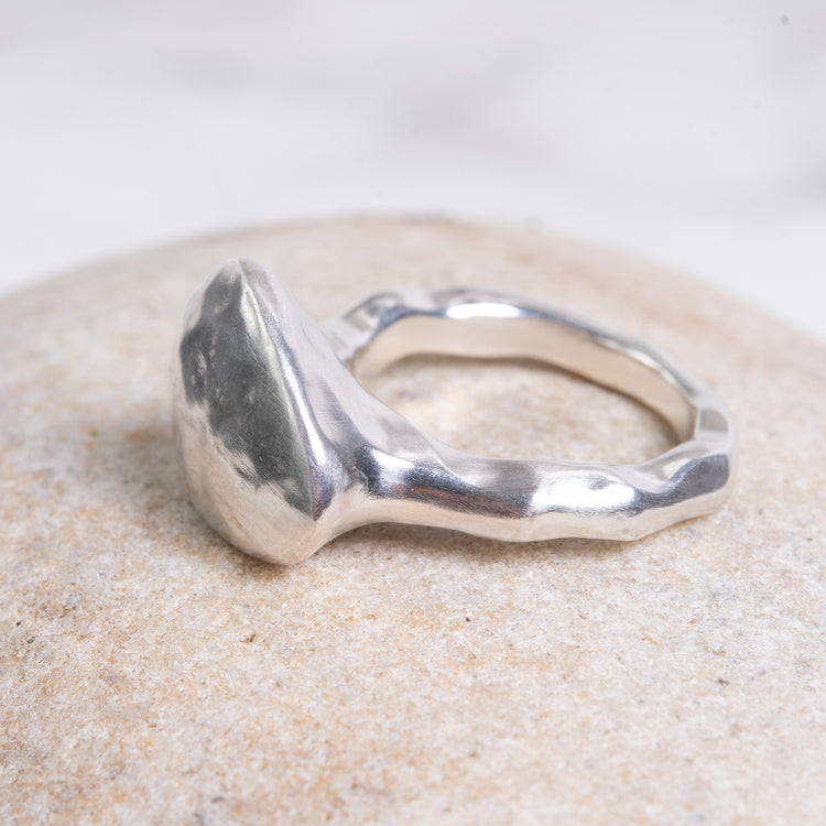 Sculptural and substantial, solid sterling silver ring. Evidence of the hand that made the piece is poetically evident. Available in size 6.5 or 7.5.