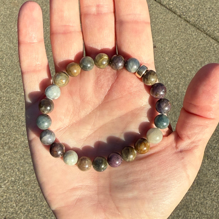 One of a kind chunky gemstone bracelet created using natural sapphires in shades of blue, grey, brown, green and pink. Earthy and beautiful.
