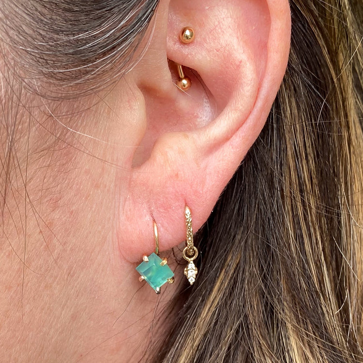 Medium/small hand cut and asymmetric Peruvian Gem Silica hook earrings set in 14k yellow, rose and white gold prongs and ear wire. Catches the light just so.